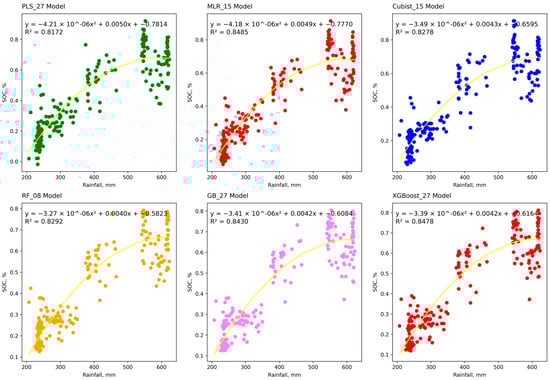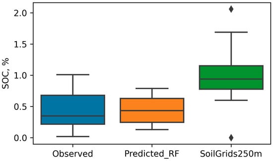 The accuracy of digital soil mapping (DSM) depends on various factors, including the selection of models and predictor variables, topographic complexity, as well as the quantity and quality of input data. Several studies have demonstrated that different machine learning models can predict SOC with high accuracy. Ref. [] reported that extreme gradient boosting (XGBoost) model with a coefficient of determination (R2) of 0.870, and root mean squared error (RMSE) of 1.818 t C ha−1 outperformed random forest (RF) and support vector machine (SVM) models. Ref. [] also found that XGBoost model with R2 = 0.7548, RMSE = 7.6792 g kg−1, and ratio of performance to deviation (RPD) = 1.1311 gave the highest SOC prediction accuracy. Ref. [] revealed that RF (R2 = 0.79, RMSE = 1.2) and Cubist (R2 = 0.77, RMSE = 1.2) recorded better accuracies than SVM and gradient boosting (GB) models. Moreover, Ref. [] testified that Cubist model (R2 = 0.64, RMSE = 1.95) gave the most precise spatial prediction of soil organic matter (SOM), and [,] reported that multiple linear regression (MLR) and GB models performed best in their respective studies. These findings underscore the importance of model selection and highlight the advantage of evaluating multiple models to enable comparison and identify alternative approaches.