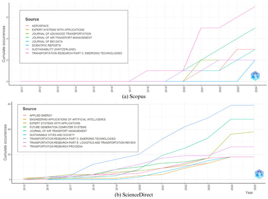 Strategic trend maps of flight delay prediction studies using machine learning method. Data from Scopus (a) and ScienceDirect (b).