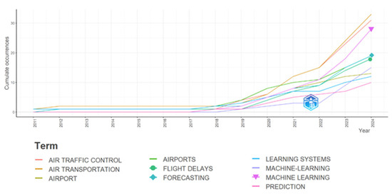 Motor Themes are associated with well-established subjects that are thoroughly integrated into the field. These themes are characterized as highly central and dense, exemplified by “air traffic flow management,” “delay predictions,” and “predictive analytics.” These themes are of significant relevance, have been extensively developed, and propel the research domain. Basic themes include “air transportation,” “air traffic control,” and “machine learning.” These themes are fundamental yet less developed. Conversely, Emerging or Declining Themes are associated with central themes, though exhibiting reduced density. These themes encompass both emerging and declining subjects, such as “flight service” and “multilayer neural networks,” which are characterized by minimal relevance and development, suggesting potential growth or decline within the field.