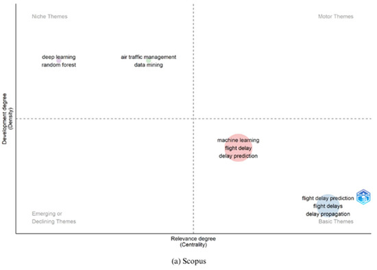 In the analysis of the Scopus database, the term “niche themes” is characterized as dense but less central topics, which are defined as specialized or limited in scope. Examples include “deep learning” and “random forest,” which, while being highly developed, are of low relevance. This suggests that these topics are well developed but not extensively connected to other themes within the field. Conversely, Basic Themes exhibit a lower degree of density and interconnectedness, often occupying more peripheral positions. In this case, Basic Themes encompass subjects such as “flight delay prediction,” “flight delays,” and “delay propagation,” which, while highly relevant, remain underdeveloped, thereby establishing a foundation for future research endeavors.