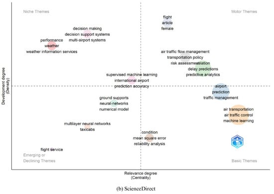 As illustrated in Figure 3b of the ScienceDirect strategy map, the themes pertaining to delay prediction by machine learning methods are categorized into four distinct classifications. The niche themes, which encompass “decision making,” “weather,” and “multi-airport systems,” among others, exhibit a high degree of development yet remain largely disconnected from other themes.