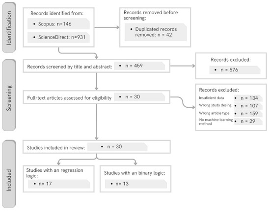 In the field of transportation studies, ref. [23] applied meta-analysis to ascertain the most accurate machine learning method, in this case for the analysis of energy management for electric vehicles. In alignment with ref. [14], the authors employ the PRISMA meta-analysis methodology, as proposed by ref. [13], ensuring a systematic, transparent, and reproducible review process.