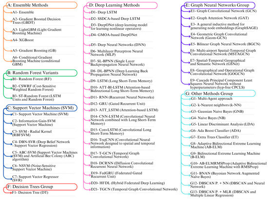 Sixty different machine learning methods were applied in the selected articles. Following the classifications presented by [41], the methods were classified into seven main groups according to the similarity of their characteristics and specific applications, Figure 5. This grouping was based on the primary function and structural architecture of the algorithms: Groups A and B aggregate ensemble and tree-based models (known for robustness), Group D aggregates deep learning (focused on generalization and sequential data), Group C aggregates vector machines (focused on classification boundaries), and Group E aggregates neural networks specialized in graph-format data.
