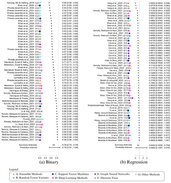 Meta-analysis is of crucial importance in prediction studies, as it facilitates the synthesis of data from multiple studies, thereby providing a comprehensive evaluation of the techniques and models employed. The systematic review was originally developed within the field of biomedical sciences [17,18,19]. However, it is increasingly applied in the context of artificial intelligence (AI), as evidenced by refs. [20,21]. In addition, ref. [20] proposed that the utilization of meta-analysis in machine learning algorithms facilitates the enhancement of the models constructed, despite the incorporation of data from disparate sources. This process is deemed to be instrumental in enhancing the precision of the forecasts obtained.