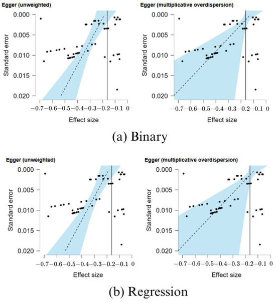 In addition, ref. [26] indicates the joint analysis of the variance of the size effect, referring to the measure of dispersion or uncertainty associated with estimating the size effect. A low variance indicates that the effect estimate is accurate, while a high variance suggests greater uncertainty. The calculation of the Size Effect Variance can be calculated using Equation (3), in which n1 and n2 are the sample sizes for the studies of the two defined analysis groups.