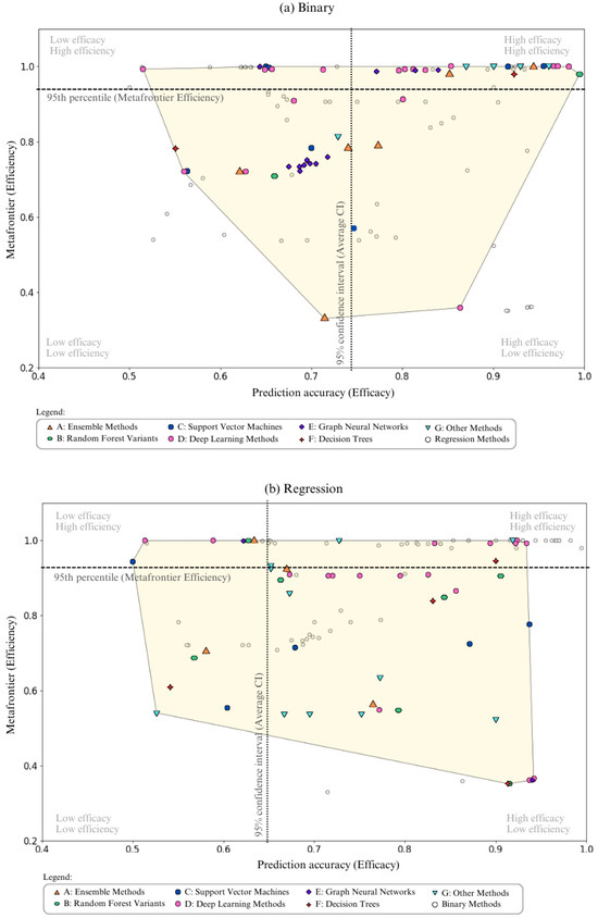 To calculate the efficiency frontiers, each study had its ML methods organized into clusters, divided between binary forecasting models and regression forecasting models. The methods were positioned according to their effectiveness and efficiency and were allocated in one of the reference quadrants. The definition of these quadrants is derived from the axis that represents the 95th percentile of the meta frontier efficiencies, in accordance with the established average 95% confidence interval (Average CI) obtained through meta-analysis for each group of applied prediction logic. Each method is hierarchized within the group corresponding to its prediction logic. However, the DEA meta-frontier allows the analysis of the excellence of each applied method, regardless of the logic applied.