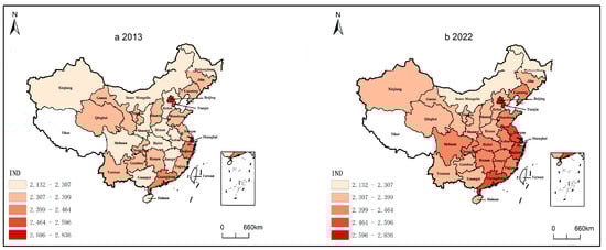Spatial evolution characteristics of provincial IND in China. Note: Areas in white represent Tibet, Hong Kong, Macao, and Taiwan in China, where data are not available. All maps are produced in accordance with the official Chinese cartographic specifications and have passed the map review under approval number GS(2023)2627.