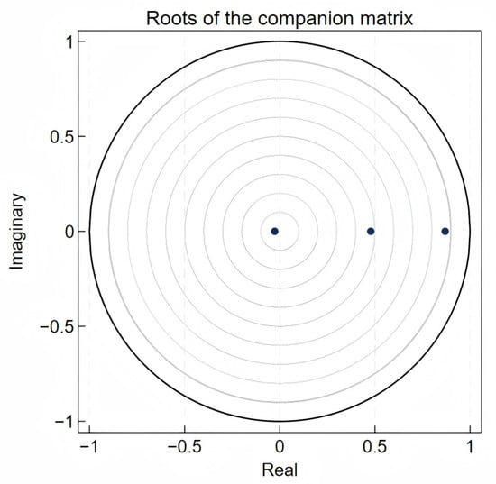 The application of the PVAR model requires adherence to specific conditions, including the assumption that the PVAR model has an infinite-order vector moving average representation and is invertible [,]. To validate the stability of the PVAR model, this study checks whether the modulus of each eigenvalue of the estimated model is less than 1. As shown in Figure 9, all eigenvalues lie within the unit circle (radius = 1), confirming that the modulus of each eigenvalue is less than 1. Thus, the PVAR model satisfies the stability condition.