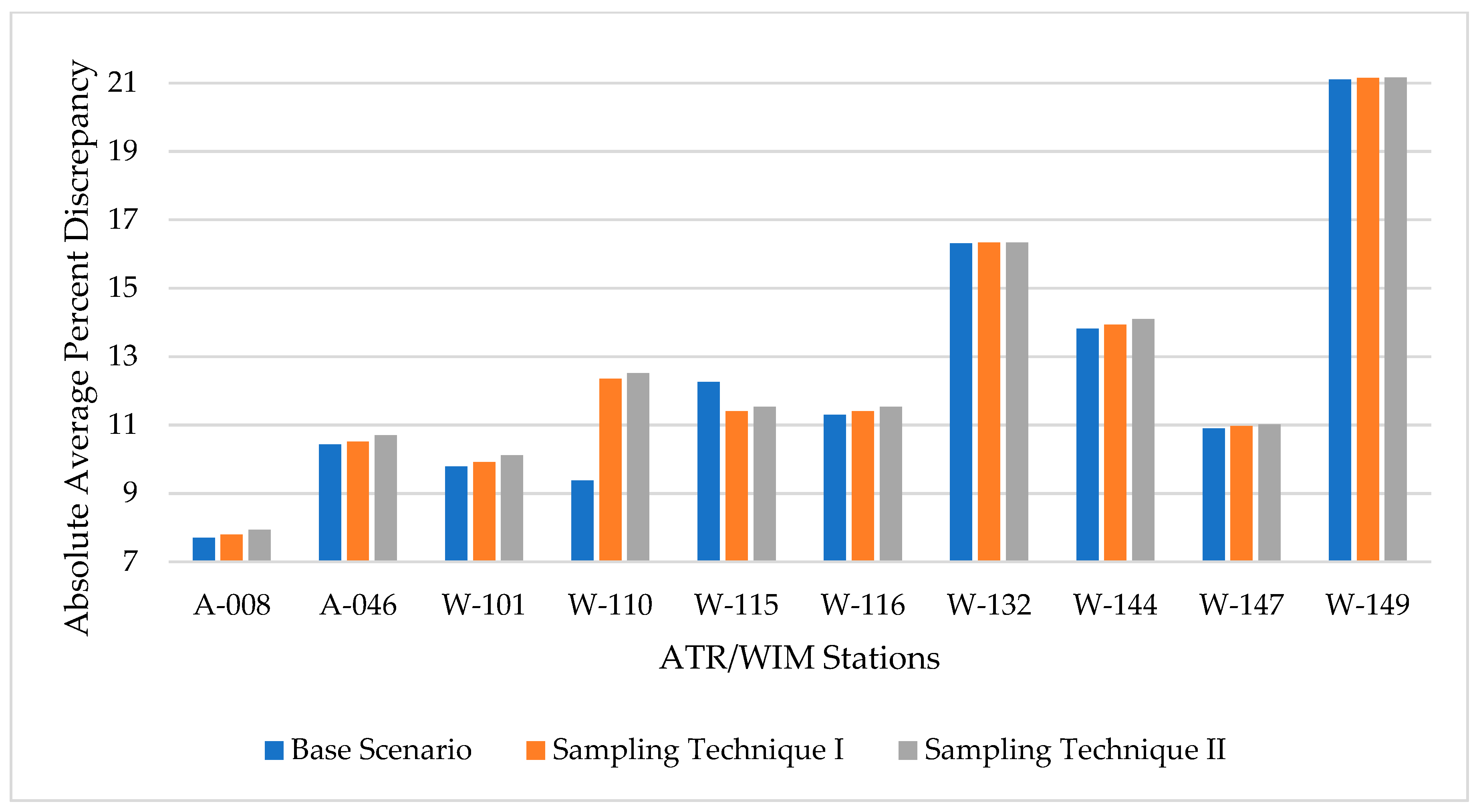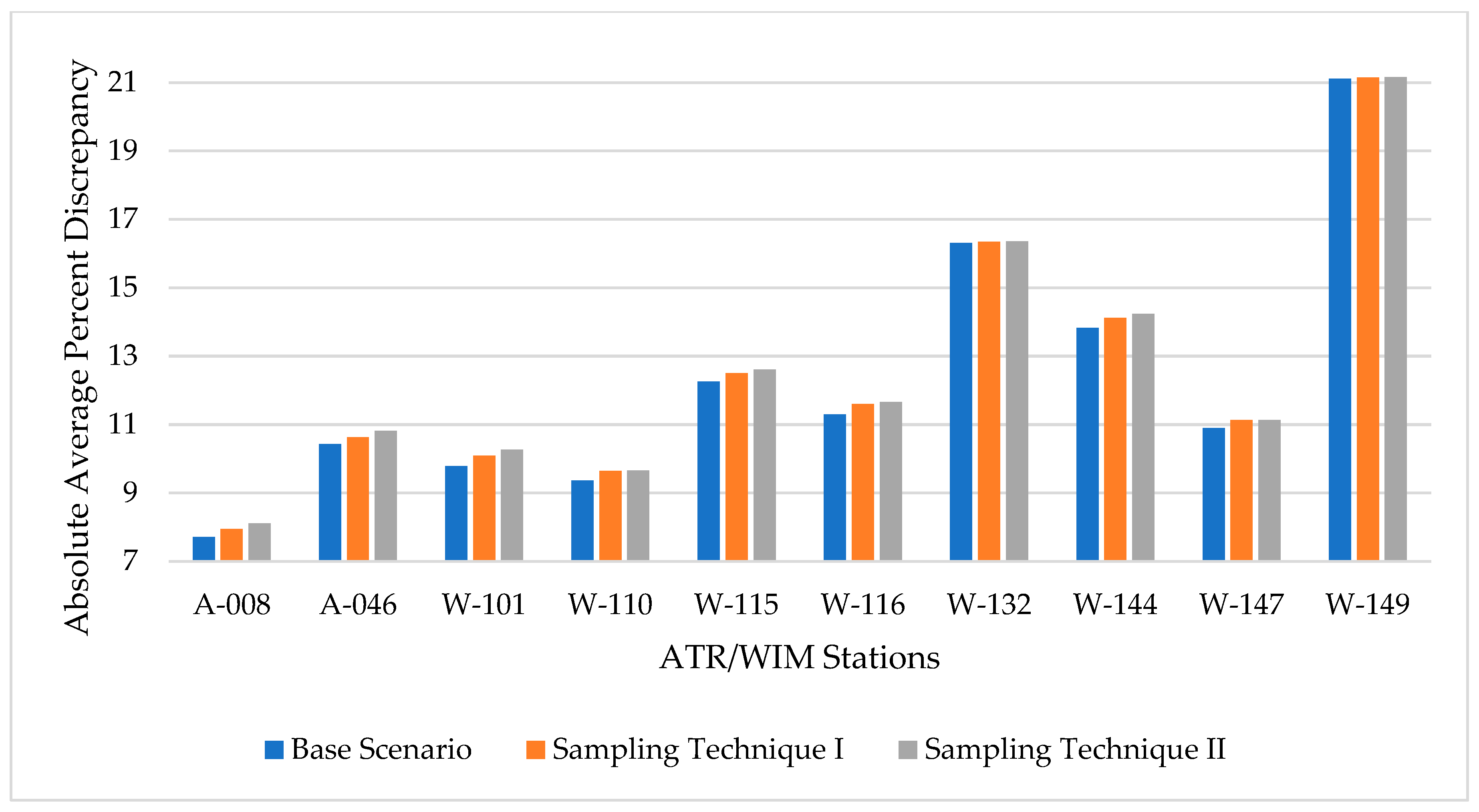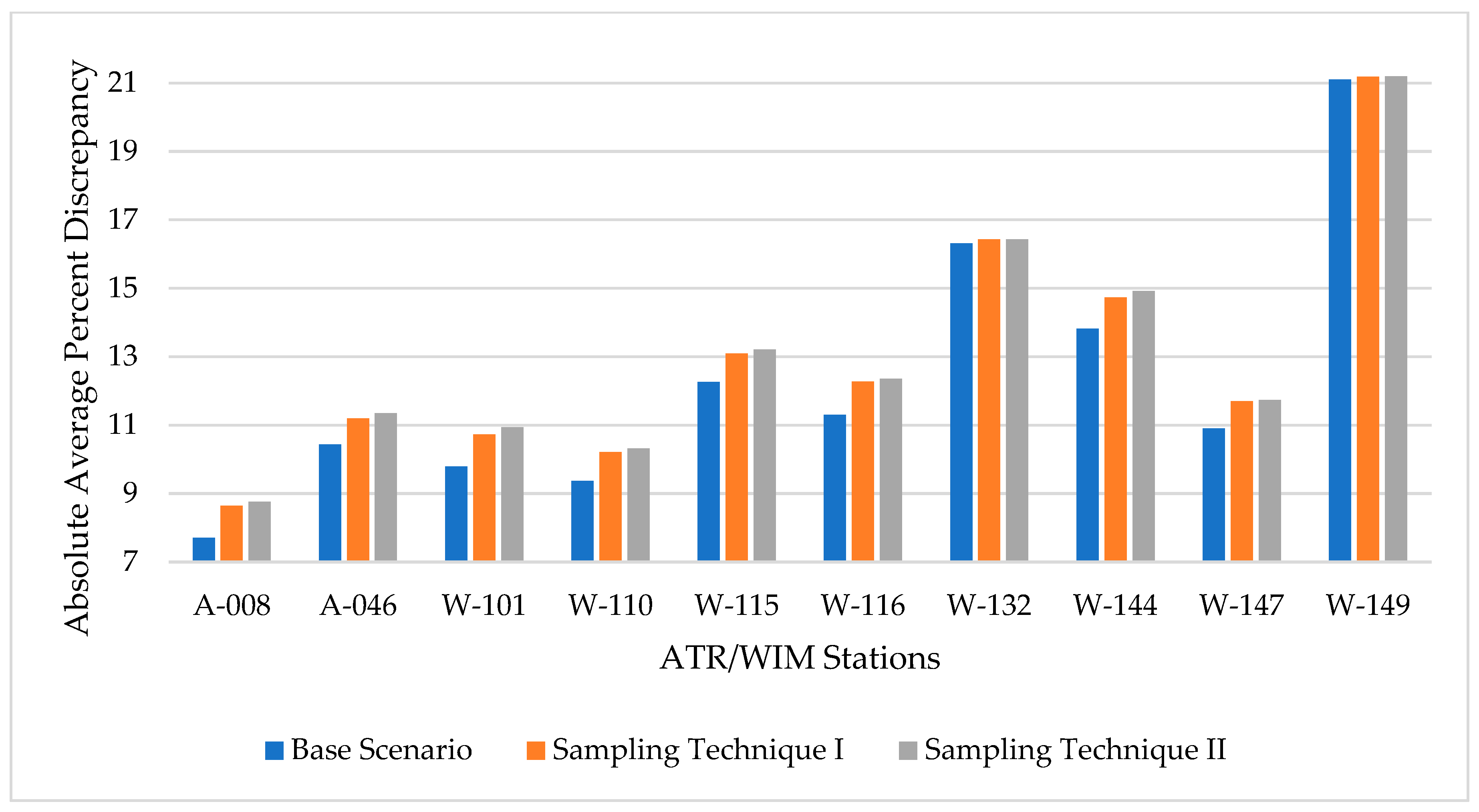 - Sampling technique I of selecting random days within the month was associated with a lower % discrepancy in AADT estimation compared with sampling technique II of selecting a random period within the month (one, two, or three weeks).