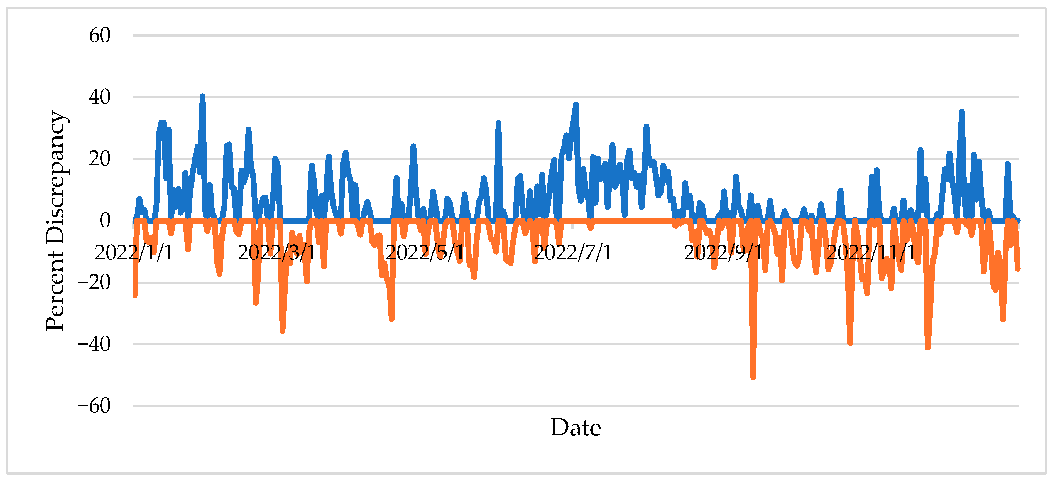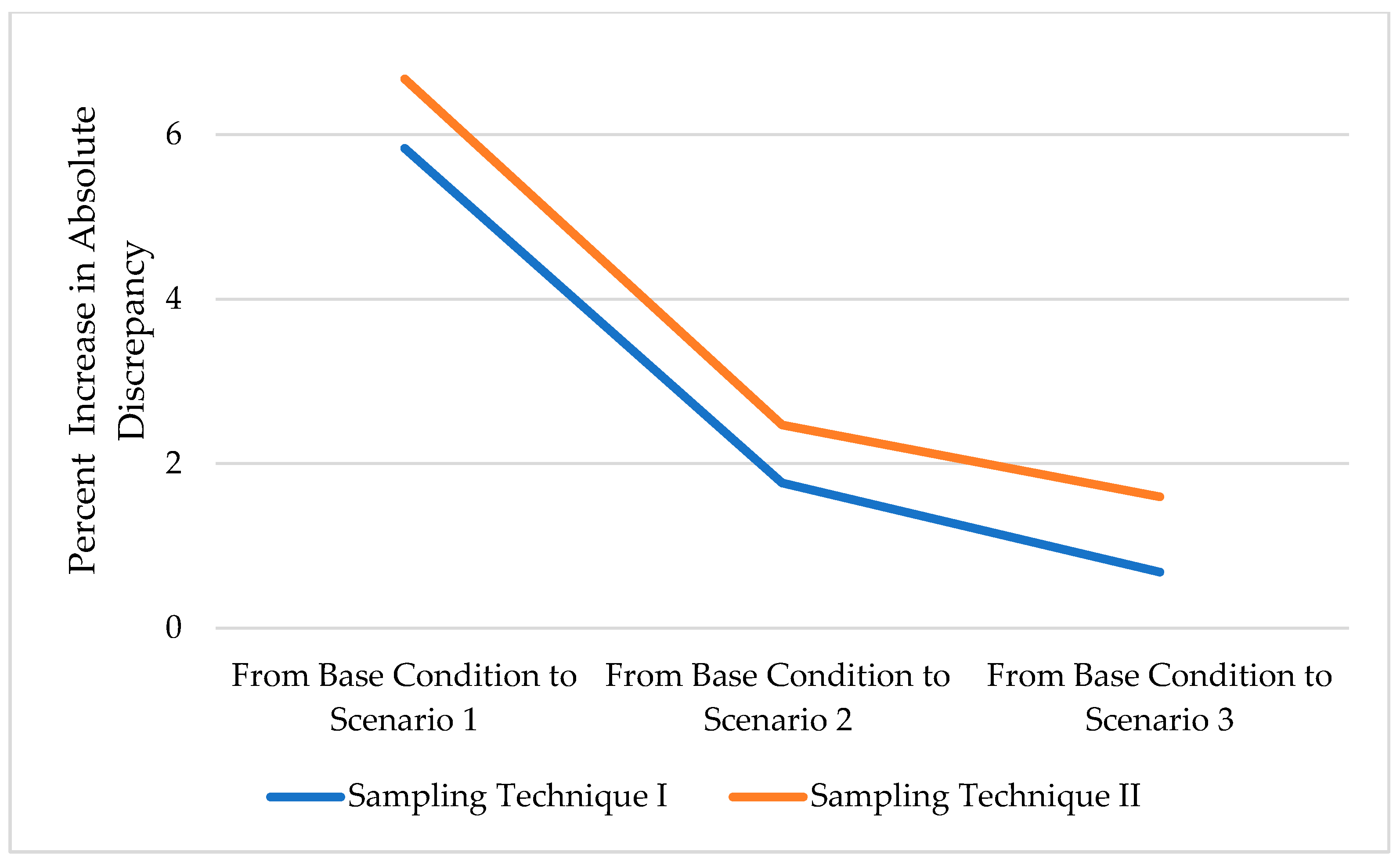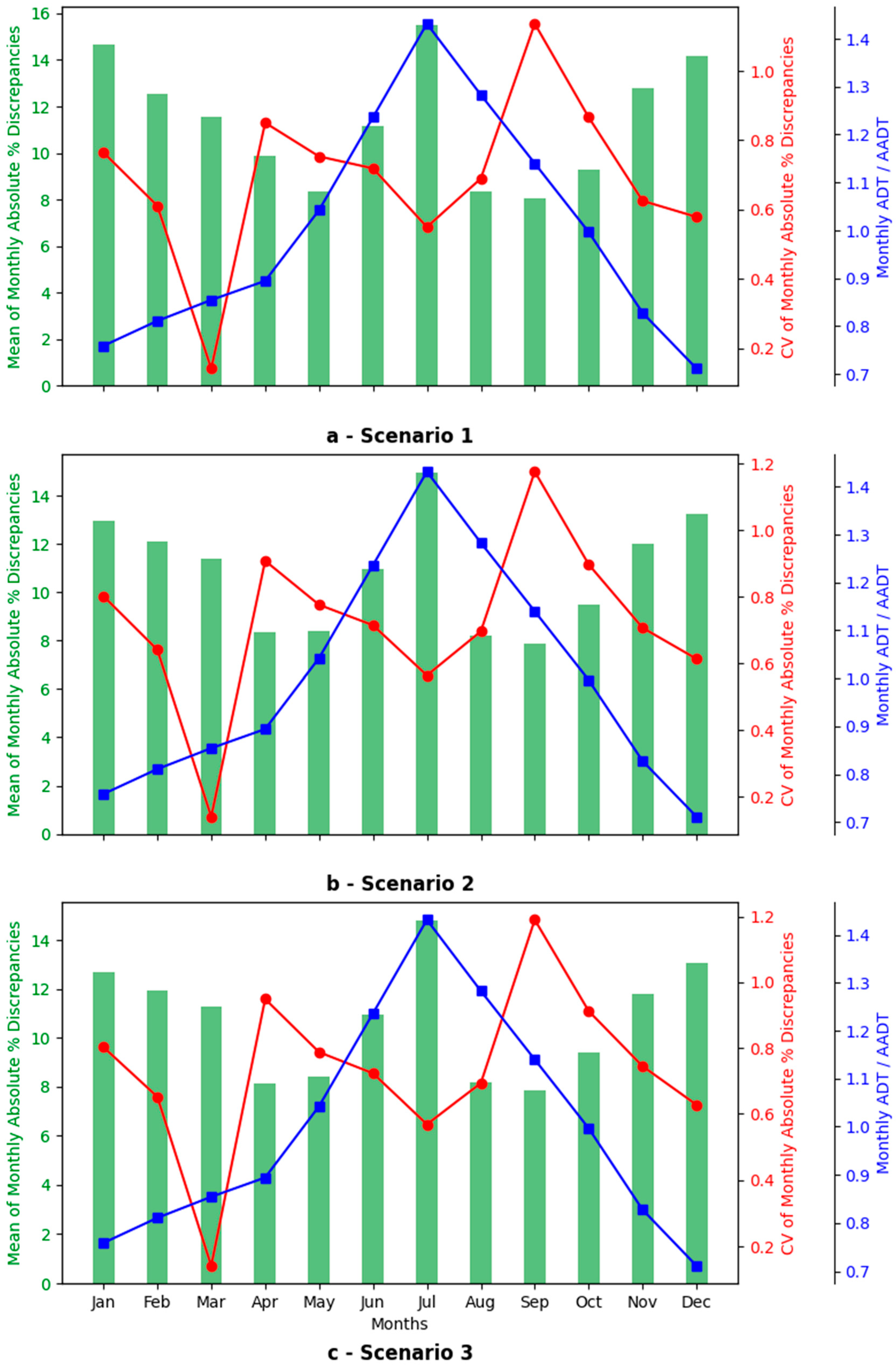 - Given the extreme scenarios of missing data used in the study (all permanent stations missing significant amounts of data simultaneously) and the relatively low effect on % discrepancy in AADT estimation (less than 7% discrepancy for the most extreme scenario), it is reasonable to conclude that the current practice in treating missing data does not involve an important compromise in the accuracy of AADT estimation. This increase remains within the ±10% error tolerance commonly referenced in FHWA’s Traffic Monitoring Guide for planning-level AADT estimation, though such discrepancies may be more critical in design or safety applications [8]. The finding also suggests that data containing at least one day of the week for each month can be used to develop daily and seasonal adjustment factors (i.e., MDOW factors) without the need to impute missing data. Based on the results, at least DOW per month appears to be the minimum acceptable threshold for reliable AADT estimation. This level of data coverage maintains accuracy within acceptable limits while capturing the necessary traffic pattern. Below this threshold, the reliability of AADT estimates may diminish, especially for design and safety-related applications that require higher precision.