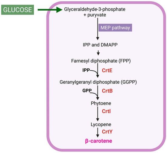 Diagram of β-carotene production. MEP, 2-C-methyl-D-erythritol 4-phosphate; IPP, isopentenyl pyrophosphate; DMAPP, dimethylallyl diphosphate; CrtE, GGPP synthase; CrtB, phytoene synthase; CrtI, phytoene dehydrogenase; CrtY, lycopene cyclase. Created in BioRender, https://BioRender.com/63nmkk6 (accessed on 25 October 2025).
