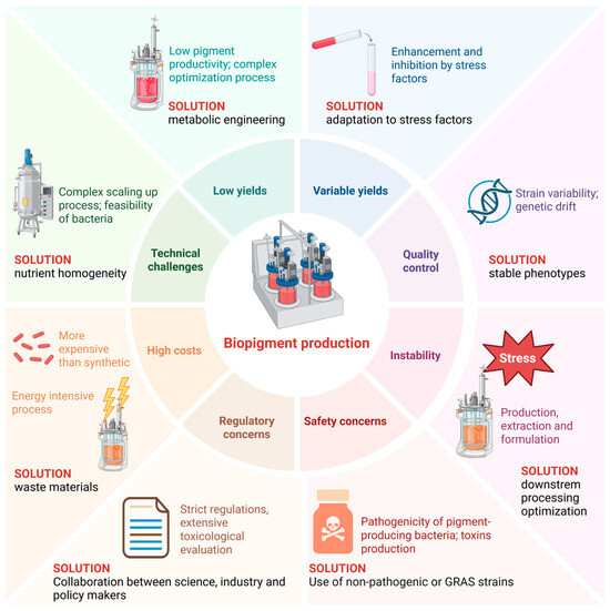 Challenges in bacterial pigments production. Created in BioRender, https://BioRender.com/muiuah8 (accessed on 25 October 2025).