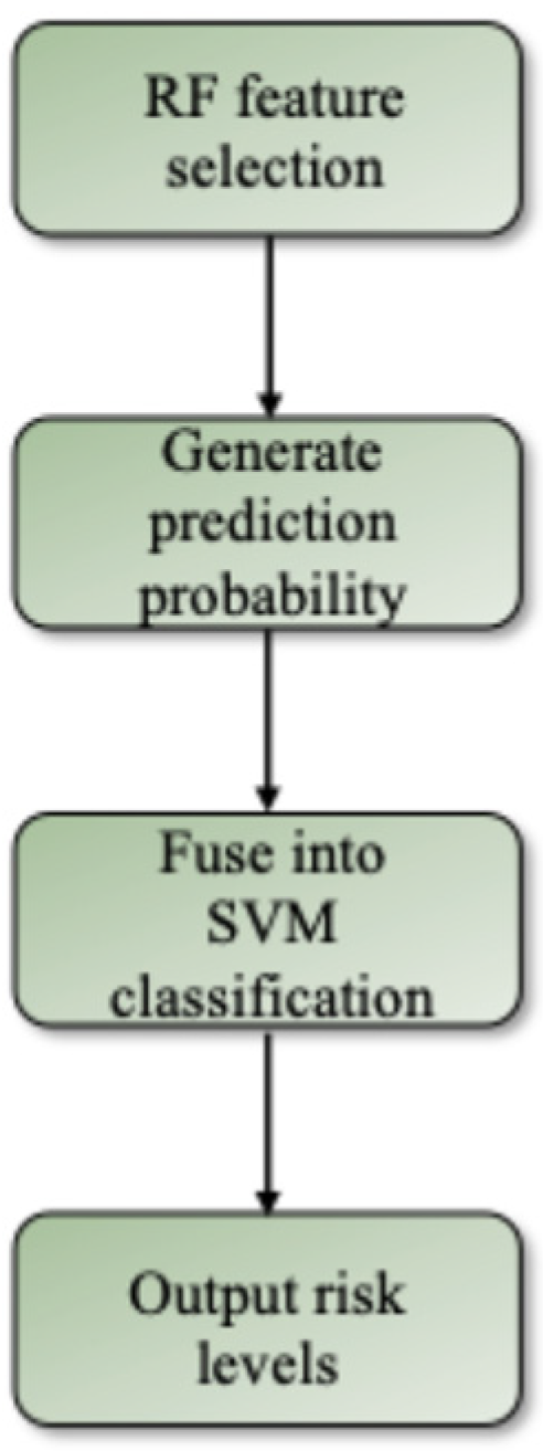 Construct SVM Input Set: Combine the selected feature subset F   and RF-derived prediction probabilities as new input data F .