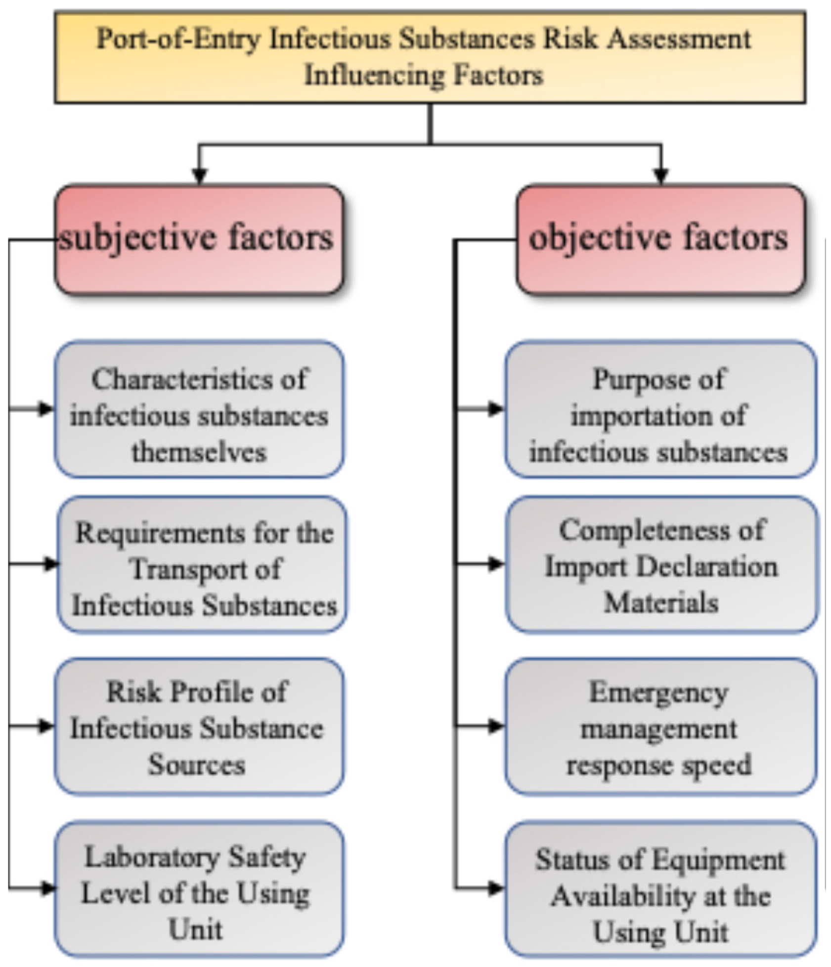 The import and export of infectious substances involve multiple dimensions of operational information, including biological characteristics, inspection approvals, packaging features, external environmental conditions, and emergency management protocols. The sources of risk in this process are highly interconnected and multidimensional. Risk factors encompass not only technical elements, such as sensitivity deviations in detection equipment and algorithmic limitations in customs data analysis systems, but also management and societal components. These include the professional competence of frontline quarantine personnel, interdepartmental coordination mechanisms, adherence to international standards for infectious substances, and public awareness regarding biohazardous materials.
