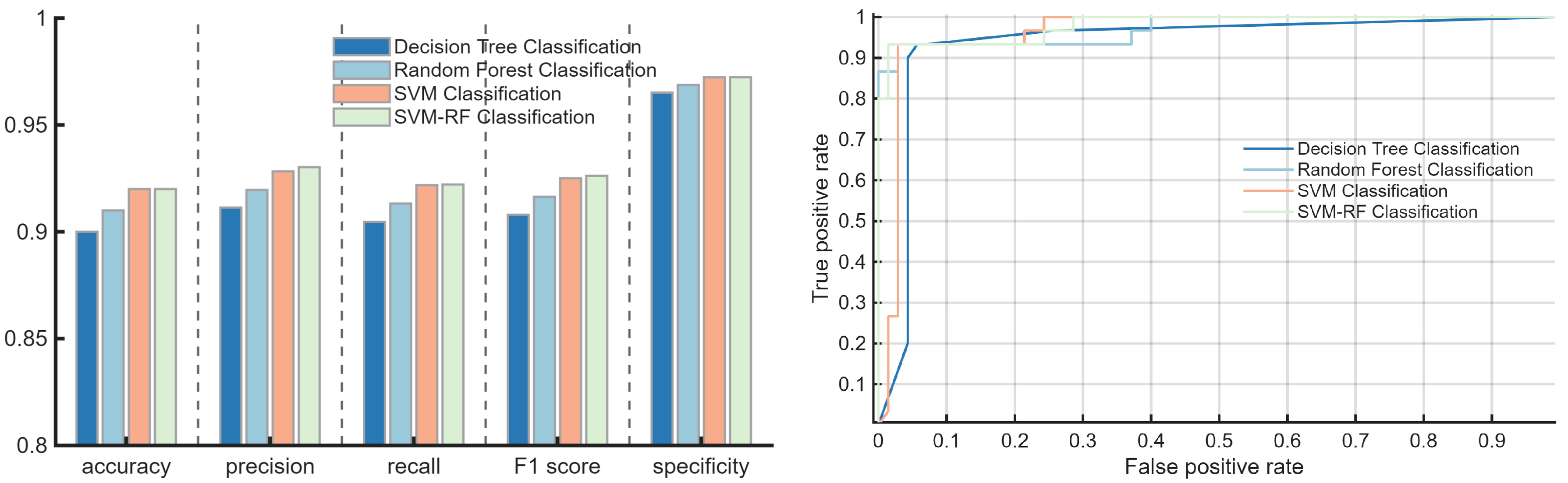 Decision tree algorithms are characterized by an intuitive tree structure and clear rule interpretability, enabling effective handling of mixed numerical and categorical data while maintaining high training efficiency. The random forest (RF) algorithm utilizes a bagging framework that integrates multiple decision trees, substantially reducing variance through dual randomization of samples and feature subsets, thereby achieving both high accuracy and strong resistance to overfitting. Support Vector Machine (SVM) algorithms construct optimal classification hyperplanes based on the principle of structural risk minimization, demonstrating strong generalization performance in small-sample, high-dimensional datasets and showing particular suitability for complex pattern recognition with well-defined decision boundaries. The fusion of SVM and Random Forest (SVM-RF) combines the capability of SVM to construct optimal separating hyperplanes in high-dimensional spaces with the ensemble advantages of RF in reducing variance and enhancing generalization, aiming to further improve overall model performance. To systematically evaluate the advantages and applicability of these algorithms, this study constructs classification models using four methods—decision trees, random forests, SVMs, and the improved SVM-RF—for comparative analysis.