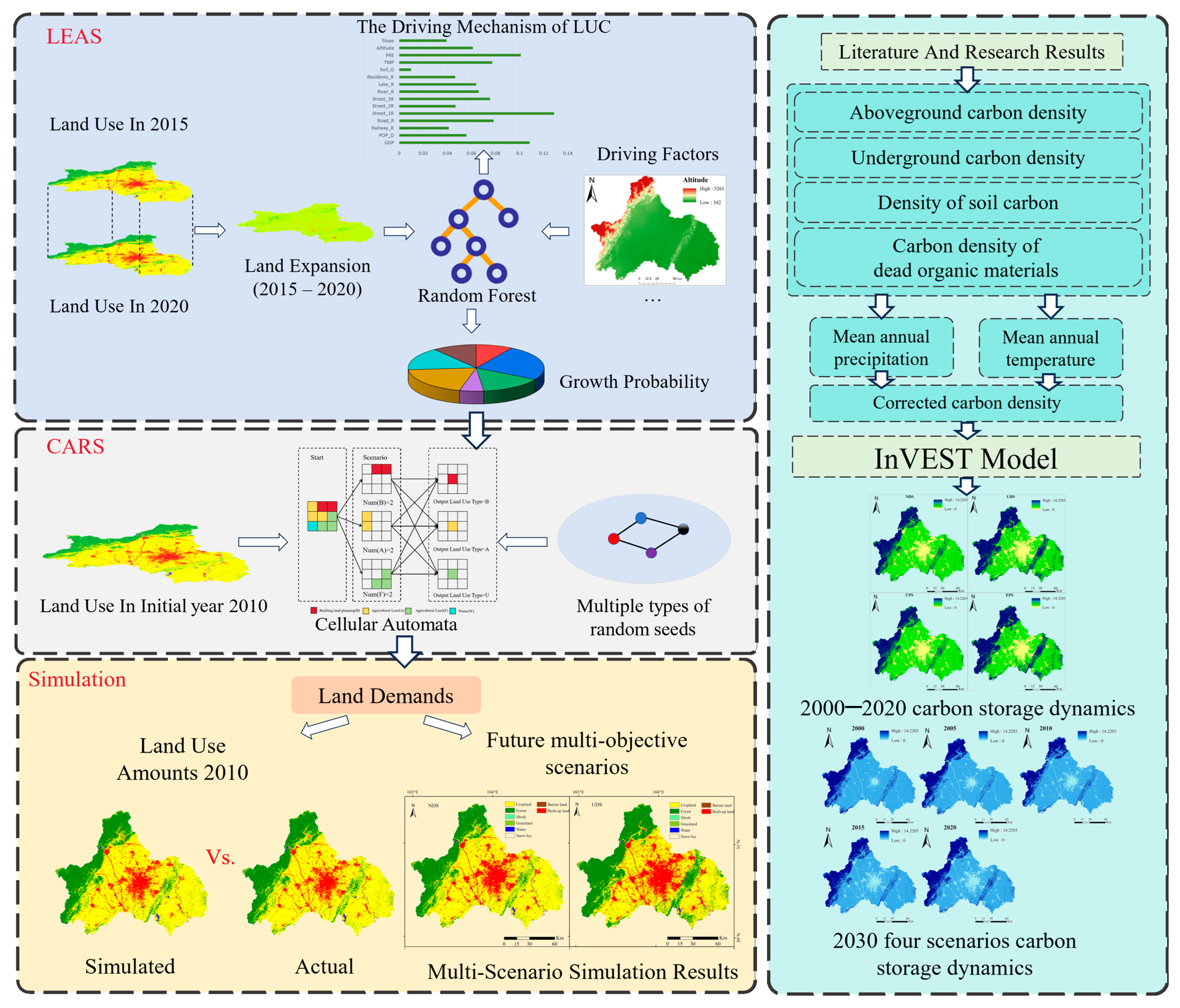 Against the background of global climate change, China has proposed the dual carbon strategy (DCS). The DCS refers to China’s goal of achieving a carbon peak by 2030 and carbon neutrality by 2060, aimed at promoting green economic transformation and sustainable development. As the world’s largest manageable carbon sink, terrestrial ecosystems play an important role in mitigating rising greenhouse gas concentrations, regulating regional climates, and maintaining biodiversity and ecological security [1,2,3,4,5]. According to the Intergovernmental Panel on Climate Change (IPCC) estimates, terrestrial ecosystems absorb and sequester approximately one-quarter of anthropogenic carbon dioxide emissions annually; their stability and sustainability directly determine the effectiveness of climate regulation [6,7,8]. Different land use types exhibit significant variations in vegetation cover, biomass accumulation, soil organic carbon storage capacity, and surface albedo [9]. The spatial combination of different land use types constitutes the regional land use. Therefore, changes in land use not only reshape the structure and function of regional ecosystems but also significantly influence the spatiotemporal distribution characteristics of carbon stocks and their carbon sink potential [10,11,12,13].