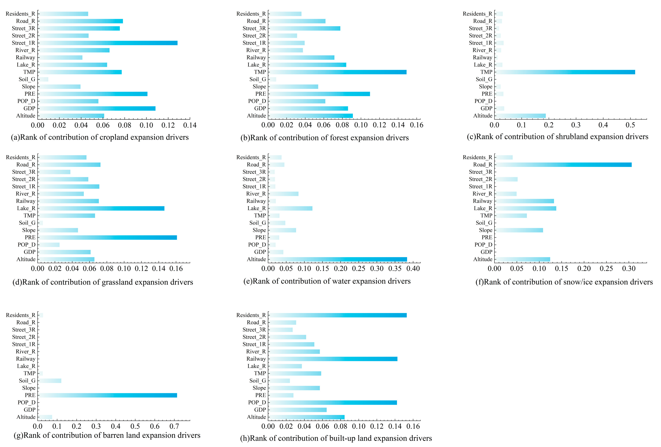 Figure 7. Contribution rates of factors to drive LULCC in Chengdu by 2030. (a) Cropland; (b) Forest; (c) Shrub; (d) Grassland; (e) Water bodies; (f) Ice/snow; (g) Bare land; (h) Built-up land.