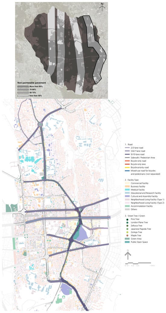 For built forms, most building materials were set as lightweight concrete. For roads and streets, asphalt and granite stone paving was used. For landscape elements, tree type, height, and density were described in Figure 3.