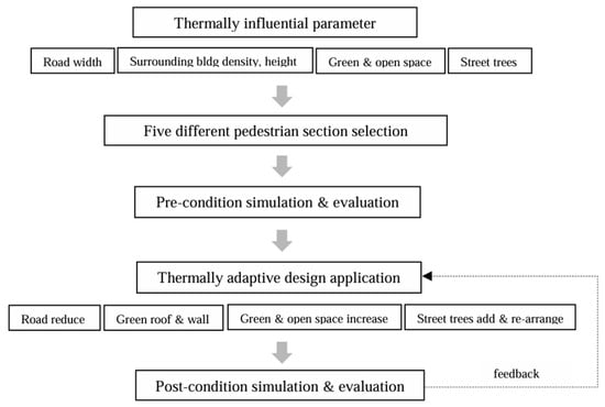 Based on a comprehensive literature review of thermal comfort factors ([21,22,23,24,25,26,27,28,29,30,31,32,33,34,35]), we identified key variables relevant to the urban pedestrian context. These variables include road width, surrounding building heights and density, adjacent green and open spaces, and street trees. We selected five different pedestrian sections along an axis, each characterized by distinct conditions regarding the studied parameters, potential design strategies focused on greening interventions, and themed open space programs based on adjacent land uses. Initially, we simulated the microclimate of the precondition of each section and evaluated the outdoor thermal comfort (OTC). Using the preliminary simulation results as a reference (see Appendix A), we developed specific site designs incorporating strategies such as road narrowing, greening interventions for surrounding buildings, expansion of green and open spaces, and the addition and rearrangement of street trees. The detailed greening designs for each section are described in the results section. We then simulated the post-design conditions of the sites, evaluated the OTC, and adjusted the site designs accordingly (Figure 2).