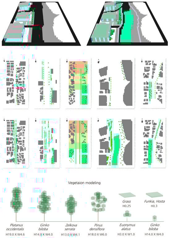Figure 3 illustrates the three-dimensional modeling of the five pedestrian redesign plans, showcasing both the before and after conditions. It also includes an enlarged example of one section where various interventions were applied, such as road reduction, greening space expansion, the addition and rearrangement of street trees and plantings, and the implementation of green walls and roofs. To simulate existing vegetation, including major street trees (Platanus occidentalis L., Ginko biloba L., Zelkova serrata, Pinus densiflora) and shrubs (Euonymus alatus, Euonymus japonica), we conducted field measurements and collected data on their heights, crown dimensions, leaf types, and arrangements. Due to the limitations of the vegetation modeling library (Albero) in ENVI-met, based on existing trees, we adjusted tree sizes and forms using coding procedures in the L-system rules within the Albero tree settings.