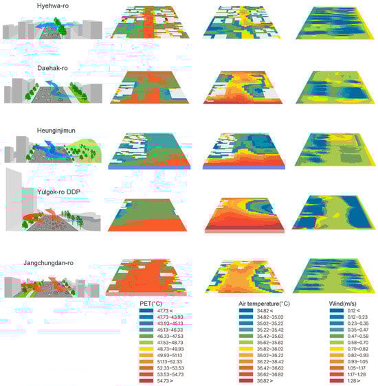 This analysis highlights considerations for design, such as the strategic placement of trees that do not obstruct wind, the selection of appropriate tree species, the utilization of cooling green spaces, the reduction of hot asphalt roads, and the expansion of pedestrian paths and greenery to facilitate cooler breezes, thereby lowering temperatures and enhancing thermal comfort. Notably, Heunginjimun Gate street demonstrated improved temperature and thermal comfort due to the presence of multi-layered vegetation in addition to the park. This will be considered in the design. Based on the analysis of the results, it is advisable to utilize the values from 1 to 2 pm, as this is when the boundary between the hot and cool areas is most clearly defined (Figure 4).