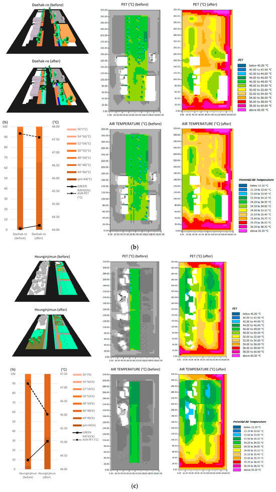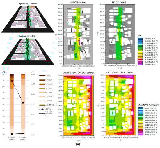 Figure 5b presents the PET and air temperature maps before and after the design application in the Daehak-ro area (right). The figure also includes the average PET values, the percentage distribution of PET-classified pixels, and the changes in green area ratio following the design application (left). Daehak-ro has been planned as a learning street, centered around educational themes, featuring institutions such as Seoul National University’s College of Medicine and its affiliated elementary and girls’ middle schools, as well as Marronnier urban park. The design proposal reduces the road width from 20–24 m to 15–18 m and secures planting space by reducing the area of buildings within the redevelopment zone by 10% considering the Floor Area Ratio (FAR) incentive regulation. Additionally, the green space of the existing resting facilities is expanded, and planting areas were added on both sides centered around a bicycle path. A small stream near the school was preserved, and air ventilation was maximized around the stream, while additional trees, shrubs, and ground cover were planted in a manner that does not obstruct ventilation. The simulation results indicate that with a 3.4% increase in the green ratio, the average PET value decreased by 0.2 °C, dropping from 47.7 °C to 47.5 °C. Notably, the area with PET values below 48 °C shows a slight increase of 5.4%, rising from 60.2% to 65.6% following the implementation of pedestrian greening strategies.