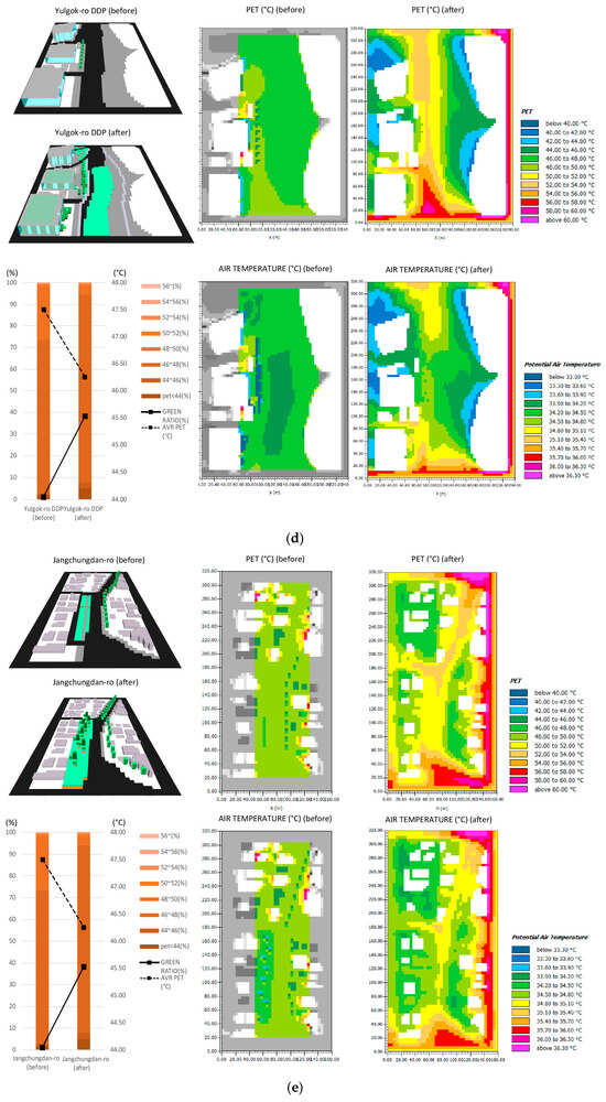 Figure 5d presents the PET and air temperature maps before and after the design application in the Yulgok-ro DDP area (right). The figure also includes the average PET values, the percentage distribution of PET-classified pixels, and the changes in green area ratio following the design application (left). The DDP (Dongdaemun Design Plaza) on Yulgok Road has been transformed by burying the wide ten-lane road underground and utilizing the grassy plaza and public spaces in front of the shopping mall. The green space has been significantly expanded, and the newly freed space has been converted to be used for events such as flea markets hosted by nearby fashion malls, Fashion Week at DDP, and the Night Market. Additionally, emergency and bus lanes have been maintained on both sides of the grassy plaza to ensure accessibility for emergencies and public transportation. The public space in front of the shopping mall will feature bike paths running through a forest and several small gardens. Climbing plants will be planted on the walls of the high-rise shopping mall. The simulation results indicate that with a 37.0% increase in the green ratio, the average PET value decreased by 1.3 °C, dropping from 47.5 °C to 46.2 °C. Notably, the area with PET values below 48 °C shows a slight increase of 20.7%, rising from 73.5% to 94.2% following the implementation of pedestrian greening strategies.