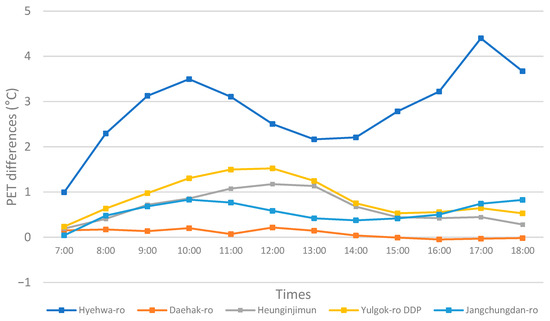 Overall, the cooling effect increased gradually until around noon and then declined in the late afternoon. The magnitude of cooling varied significantly across locations, with the most noticeable variation observed on Hyehwa-ro Street. There, PET reductions ranged from 1.0 °C to 4.4 °C, with the greatest cooling effect occurring at 5 pm. In contrast, Daehak-ro exhibited the smallest change, with cooling magnitudes ranging from −0.05 °C to 0.22 °C. All streets, except Daehak-ro at 4 pm, demonstrated improved thermal comfort levels, with PET reductions ranging from 0 °C to 4.4 °C.