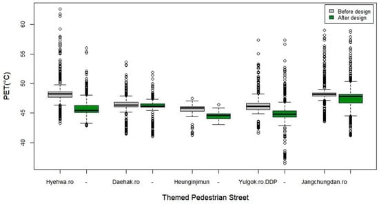 Box plots of 1 pm PET before and after pedestrian design for five themed streets.