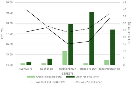 For example, although Hyehwa-ro experienced the smallest increase in greening ratio, it exhibited the greatest reduction in PET. Conversely, Jangchungdan-ro showed the second-largest increase in greening ratio, yet the associated cooling effect, as indicated by PET, was comparatively minimal.