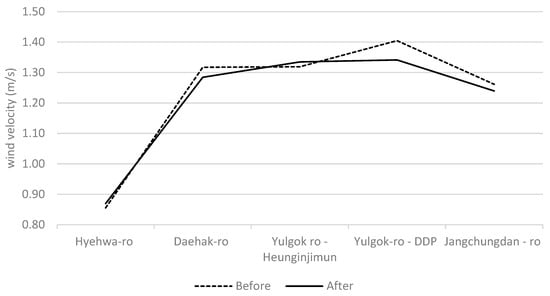 Notably, a significantly greater cooling effect was observed on Hyehwa-ro—a street characterized by shallow width, higher density, and lower building heights—where trees were proven to weaken the existing wind corridor in precondition simulation. Figure 9 illustrates that, in most street segments, the presence of trees reduces wind velocity. Consequently, achieving a balance between incorporating greenery and maintaining adequate wind flow became a key consideration in multiple design iterations. For Hyehwa-ro Street, the greening was carefully implemented without reducing wind velocity. Despite having the smallest increase in green area, this location exhibited a distinctively high cooling efficiency. Conversely, Jangchungdan-ro, which shares similar spatial characteristics with Hyehwa-ro, showed the lowest cooling efficiency. In this case, even a slight reduction in wind velocity from an initially high level appeared to diminish the cooling effect. These findings highlight the critical role of maintaining and managing wind flow in densely built, narrow urban environments to maximize the benefits of greening strategies.