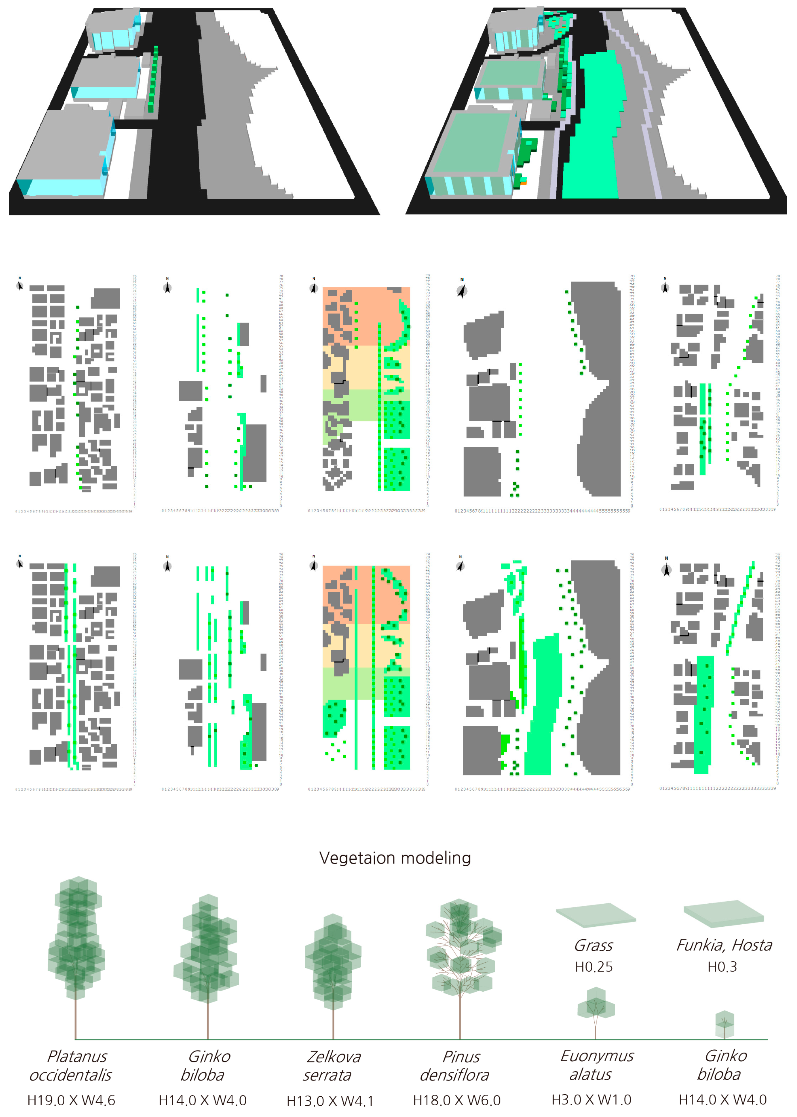| Landscape elements | Tree type, height, density | As described in Figure 3 |