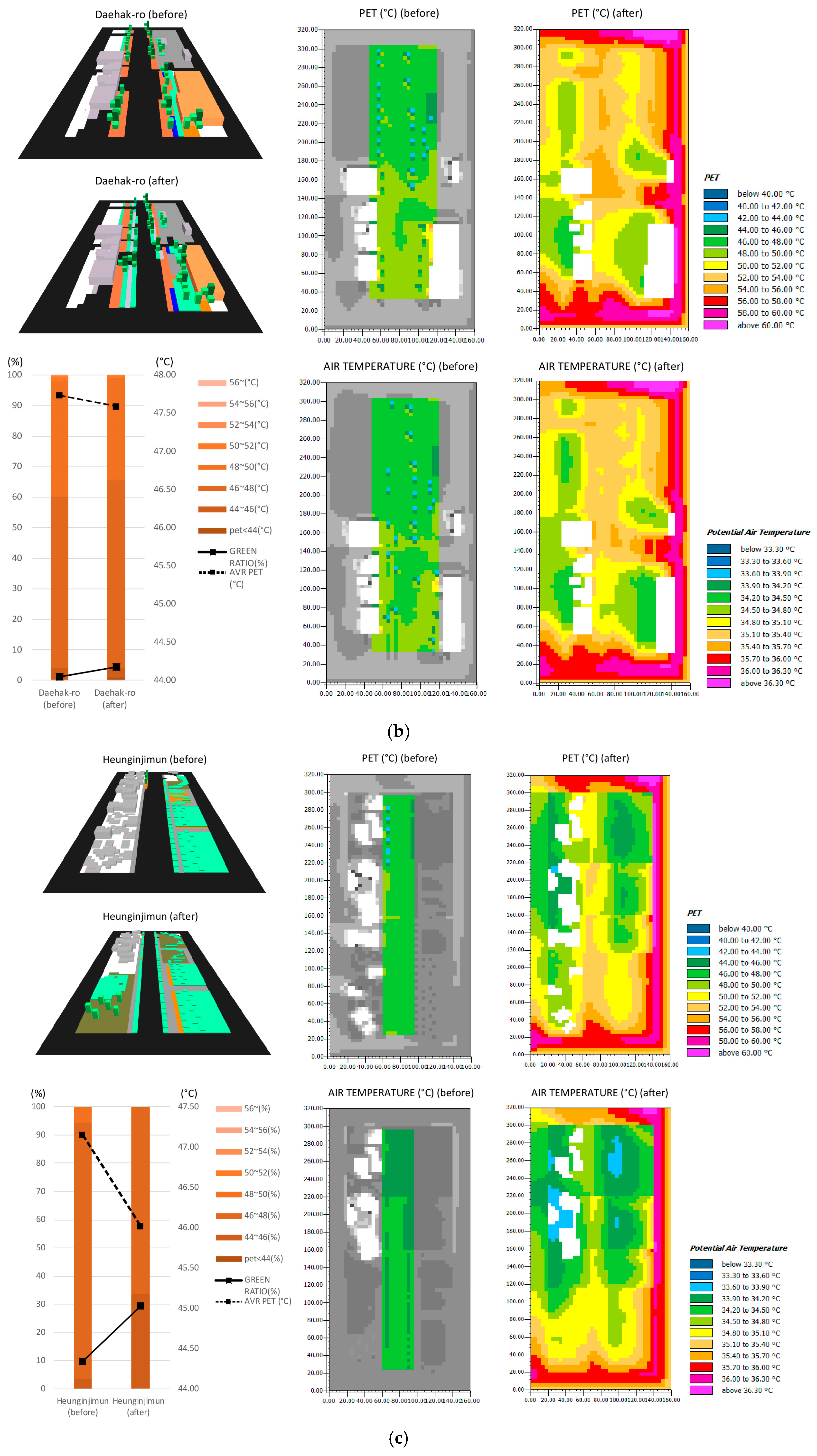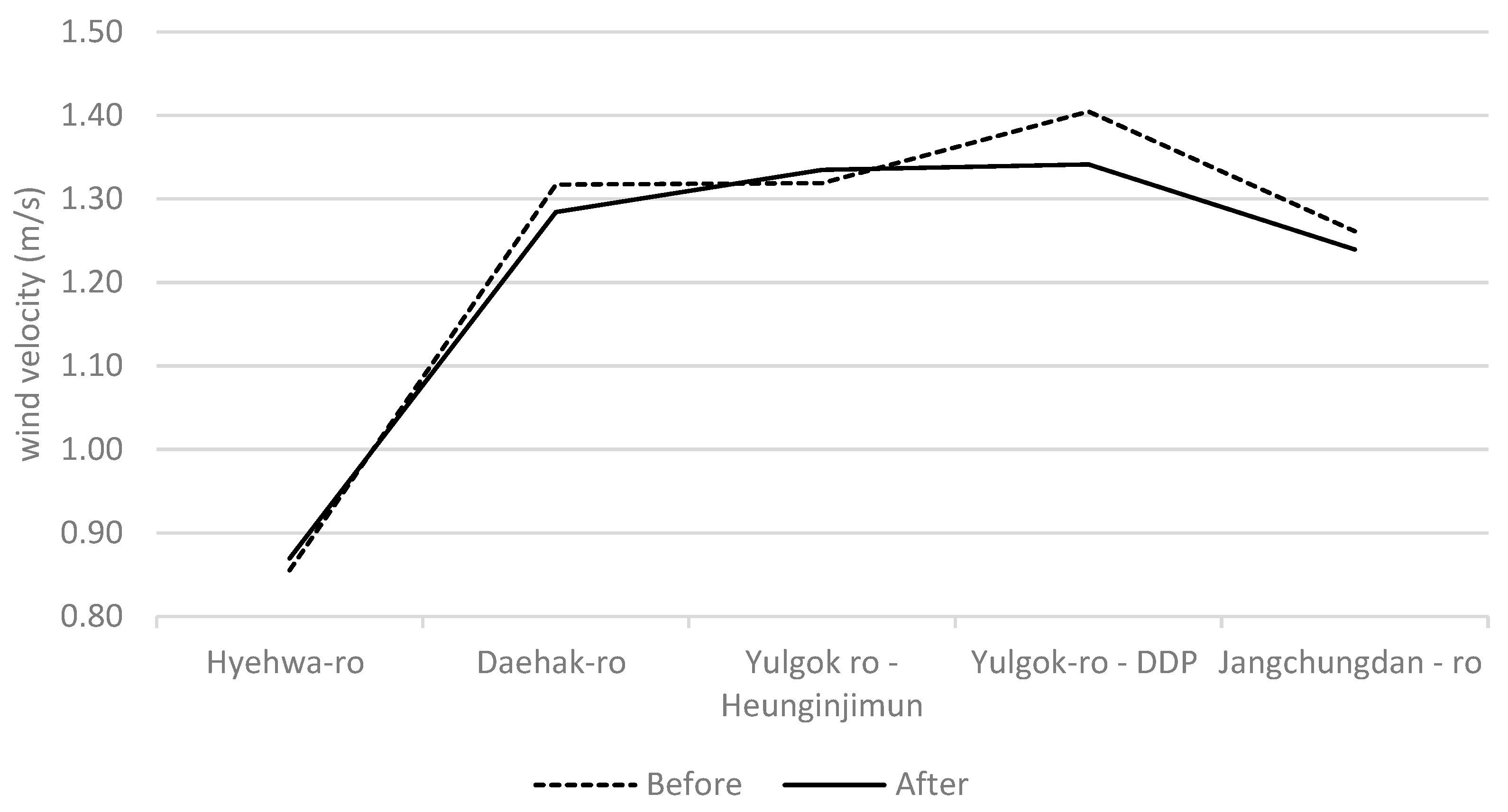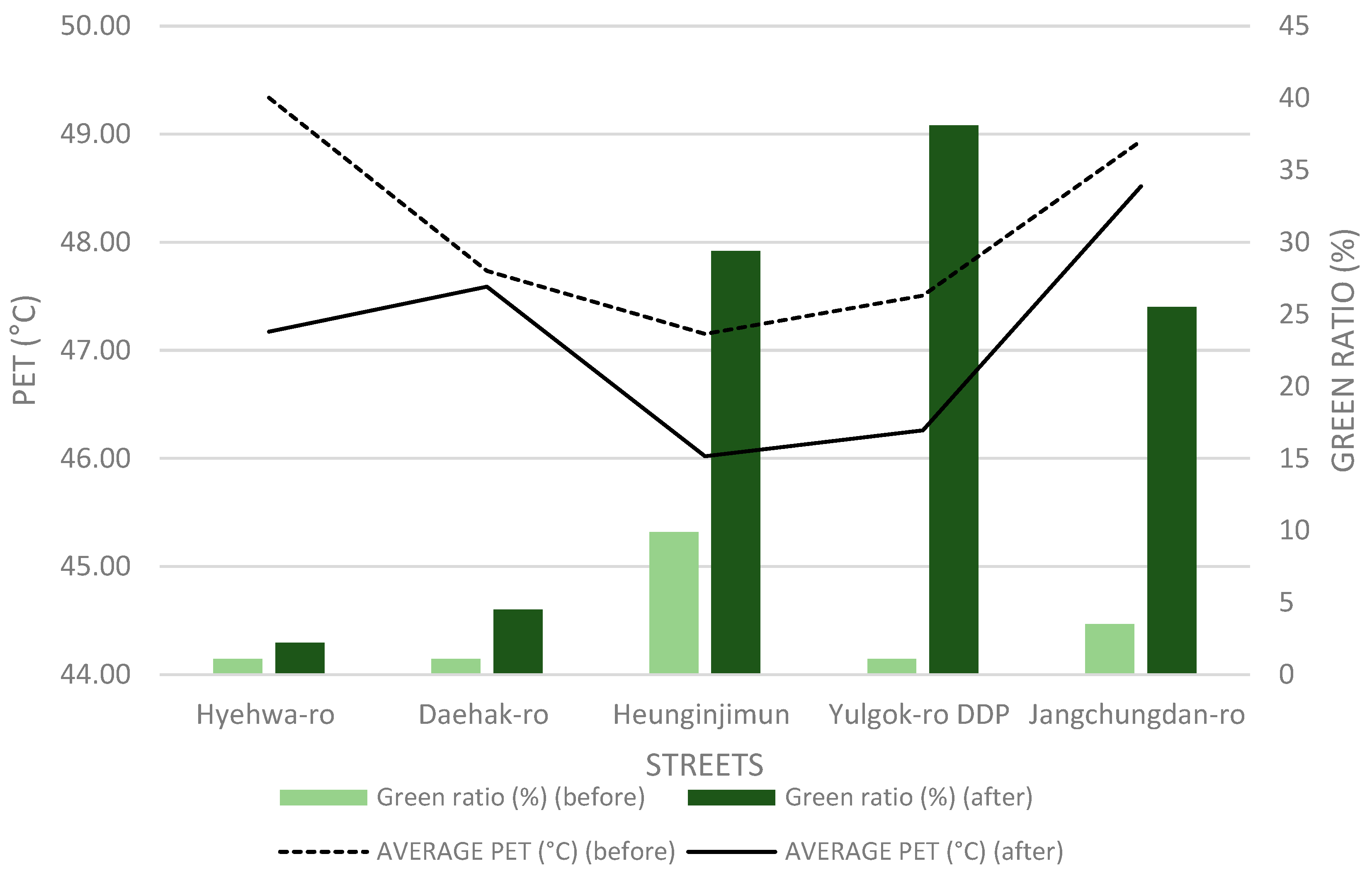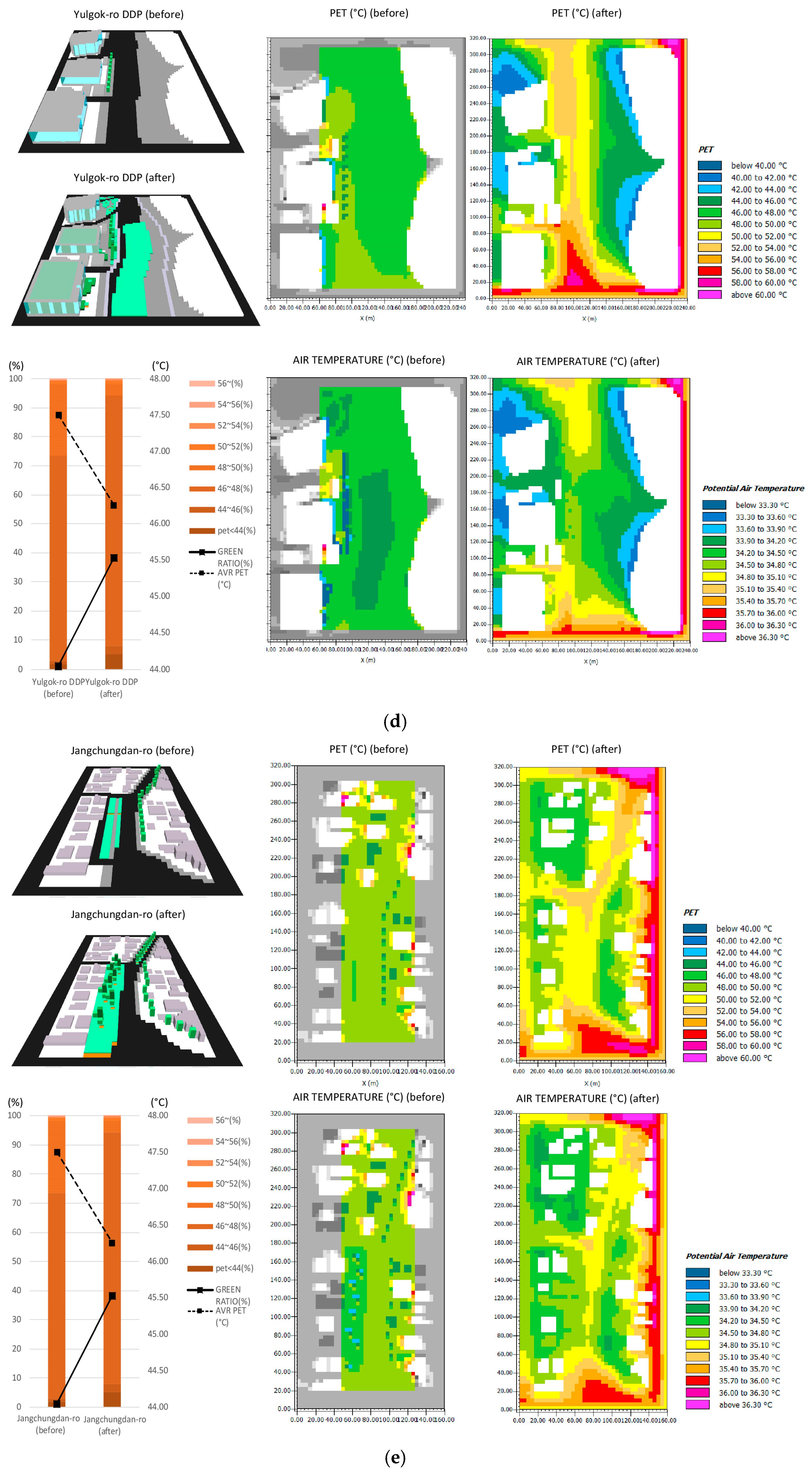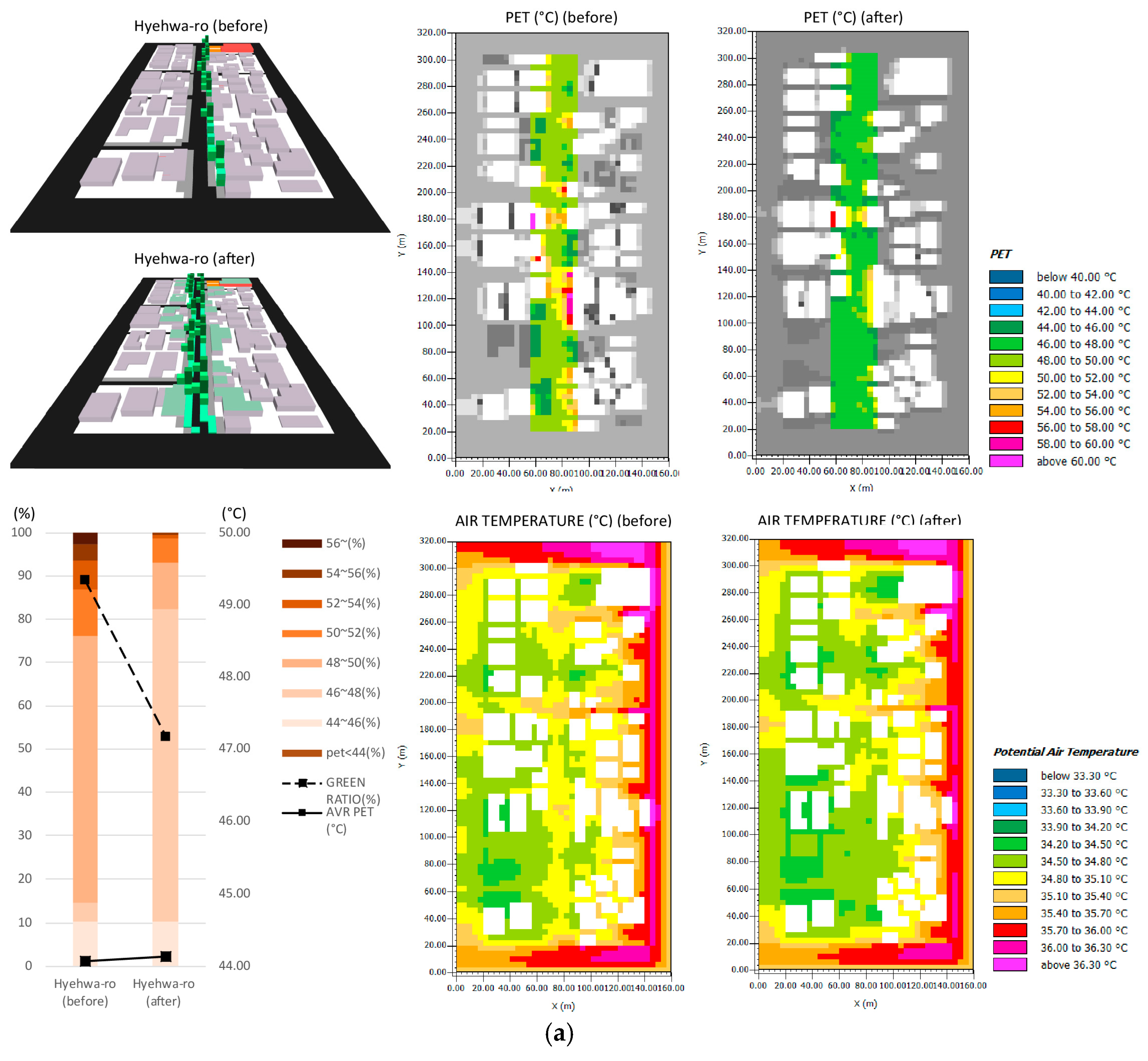4.2. Design Application and Thermal Comfort Comparison Before and After Pedestrian Design