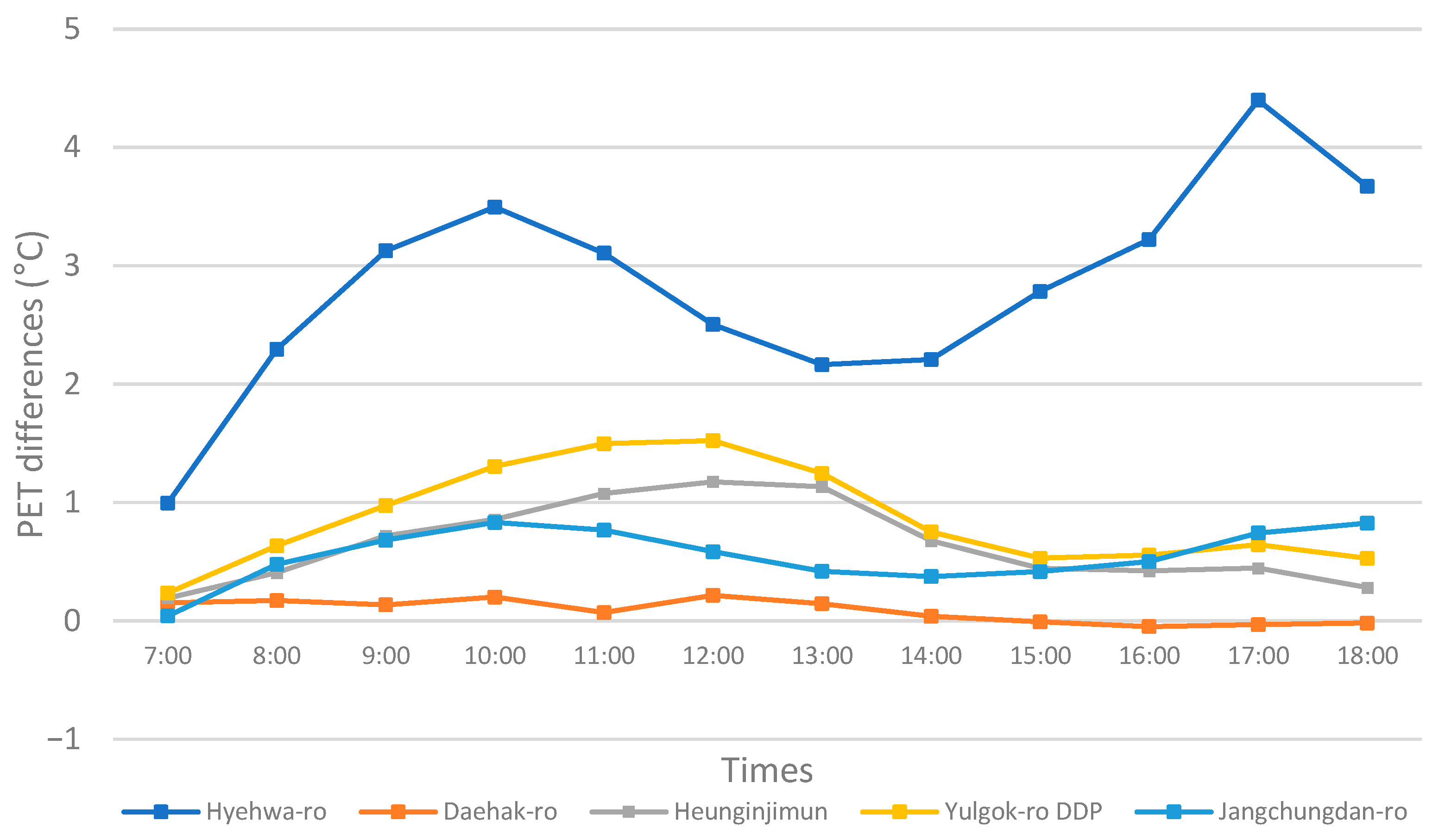 4.3. Temporal Thermal Comfort Comparison Before and After Pedestrian Design