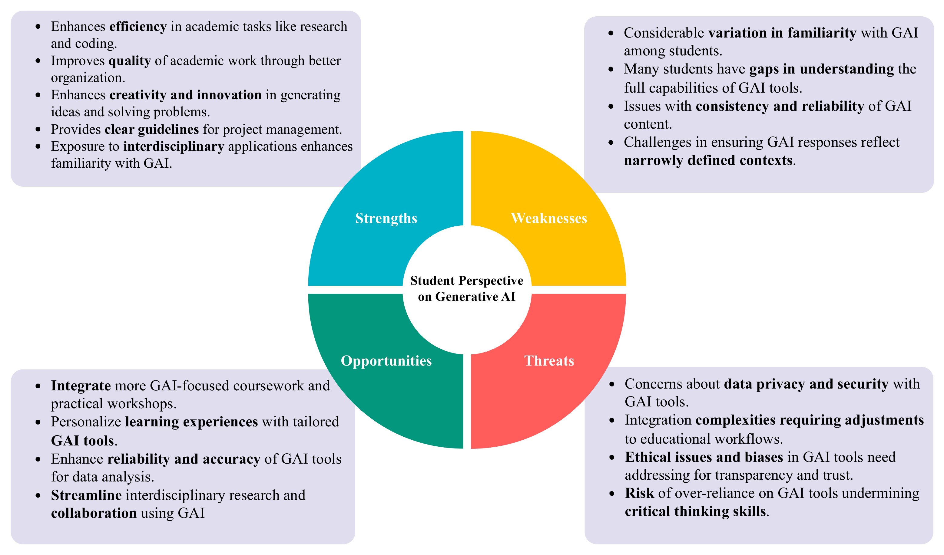 Finally, while this study focuses primarily on the integration of GAI within engineering education, its implications extend well beyond academia. The insights drawn from students’ and faculty members’ experiences can inform strategies for diverse organizations, ranging from government agencies to private enterprises, seeking to harness the potential of these technologies responsibly. As GAI continues to evolve, it is reshaping how we interact with information by transforming static data into dynamic, adaptive insights. This paradigm shift mirrors broader technological disruptions observed across sectors, from the digitization of media to the automation of industrial operations. A critical question thus emerges: will GAI remain a supportive tool that enhances human productivity and creativity, or will it fundamentally redefine the landscape of academic and professional work? By addressing the ethical, technical, and pedagogical challenges identified in this study, institutions and organizations alike can position themselves at the forefront of this transformation, ensuring that GAI complements human ingenuity and contributes to a more sustainable and equitable future.