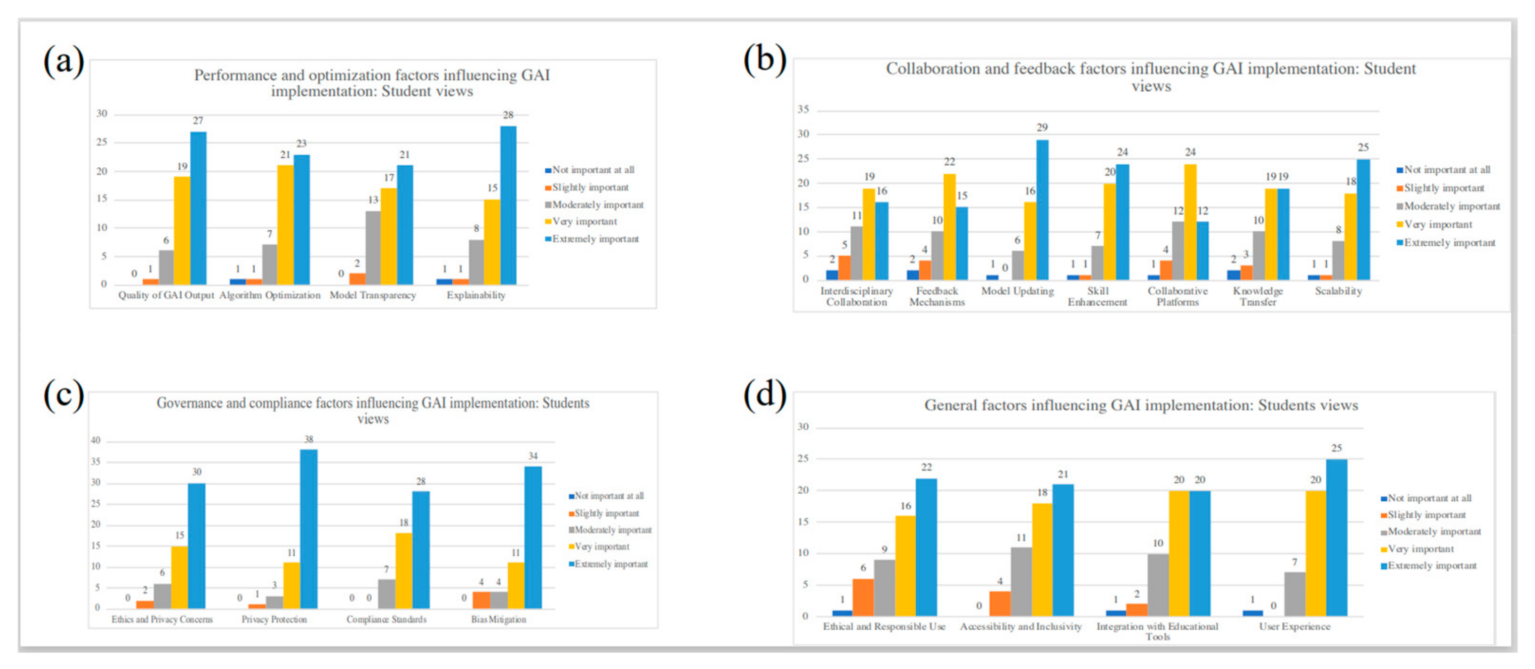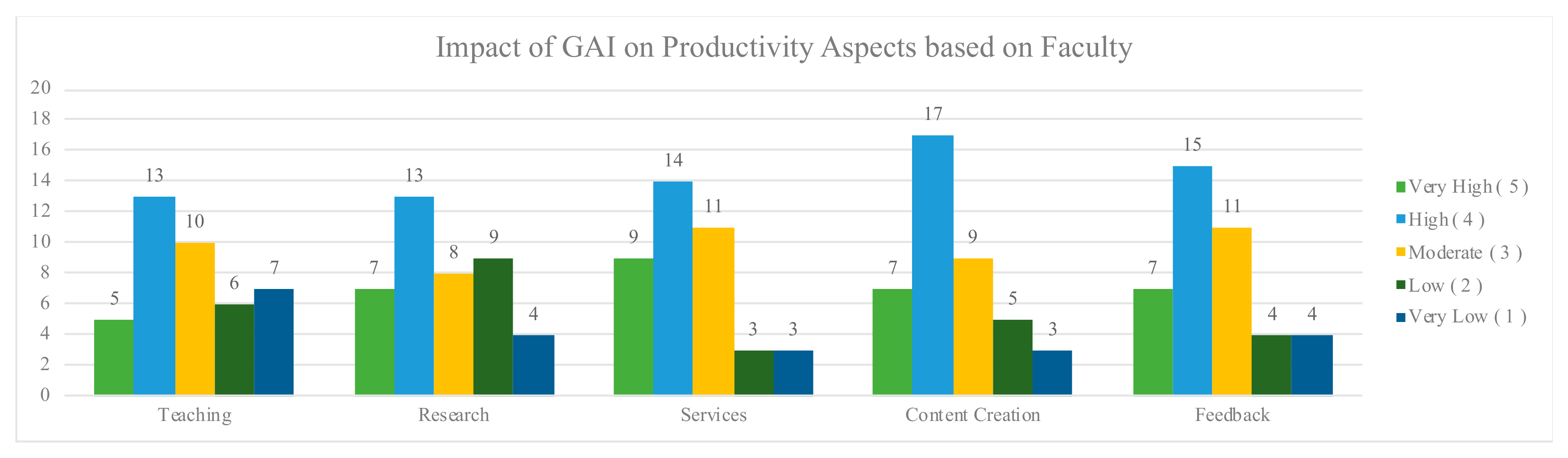Furthermore, the data revealed divergent perspectives on GAI’s role in education. Students viewed GAI as a tool to enhance academic success, creativity, and efficiency, emphasizing immediate benefits such as faster assignment completion and innovative project design. In contrast, faculty were more focused on the long-term implications, such as safeguarding academic integrity, maintaining high educational standards, and ensuring compliance with ethical norms. These contrasting views highlight the need for a balanced approach to GAI integration that addresses both groups’ priorities and aligns with sustainability goals that promote innovation without compromising ethics, inclusivity, or long-term educational quality.