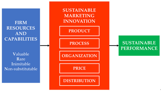Conceptual framework linking RBV constructs with sustainable marketing innovation dimensions and sustainable performance.