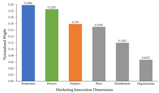 The normalized weights obtained from Table 6 were used to rank the six innovation dimensions. Promotion emerged as the top priority (0.2384), followed by process (0.2253) and product (0.1790). Price, distribution, and organization received lower relative weights, reflecting their comparatively smaller contribution to sustainable marketing performance.