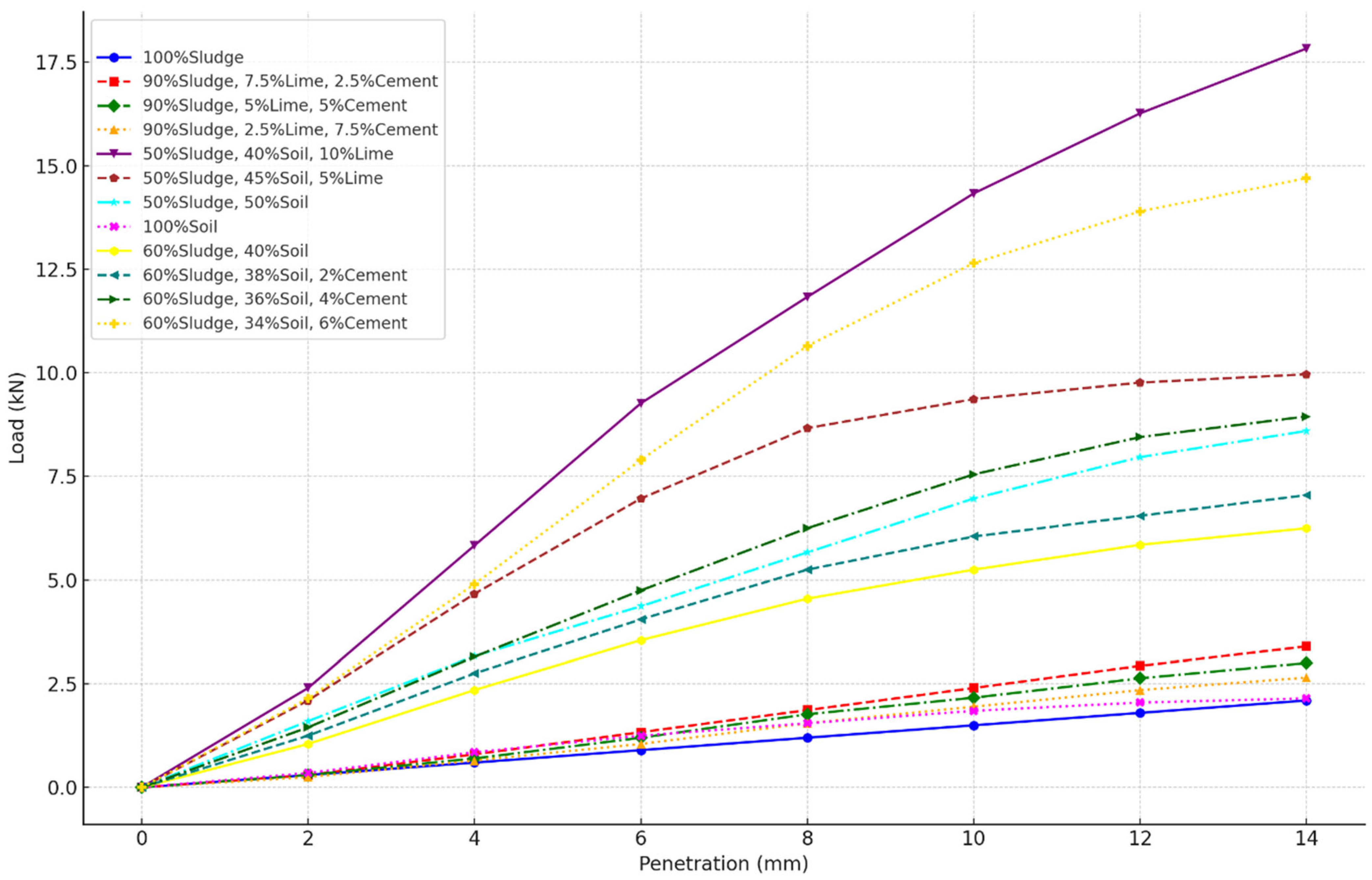 Different mix designs are developed to evaluate the mechanical performance of sludge combined with soil, lime, and cement.