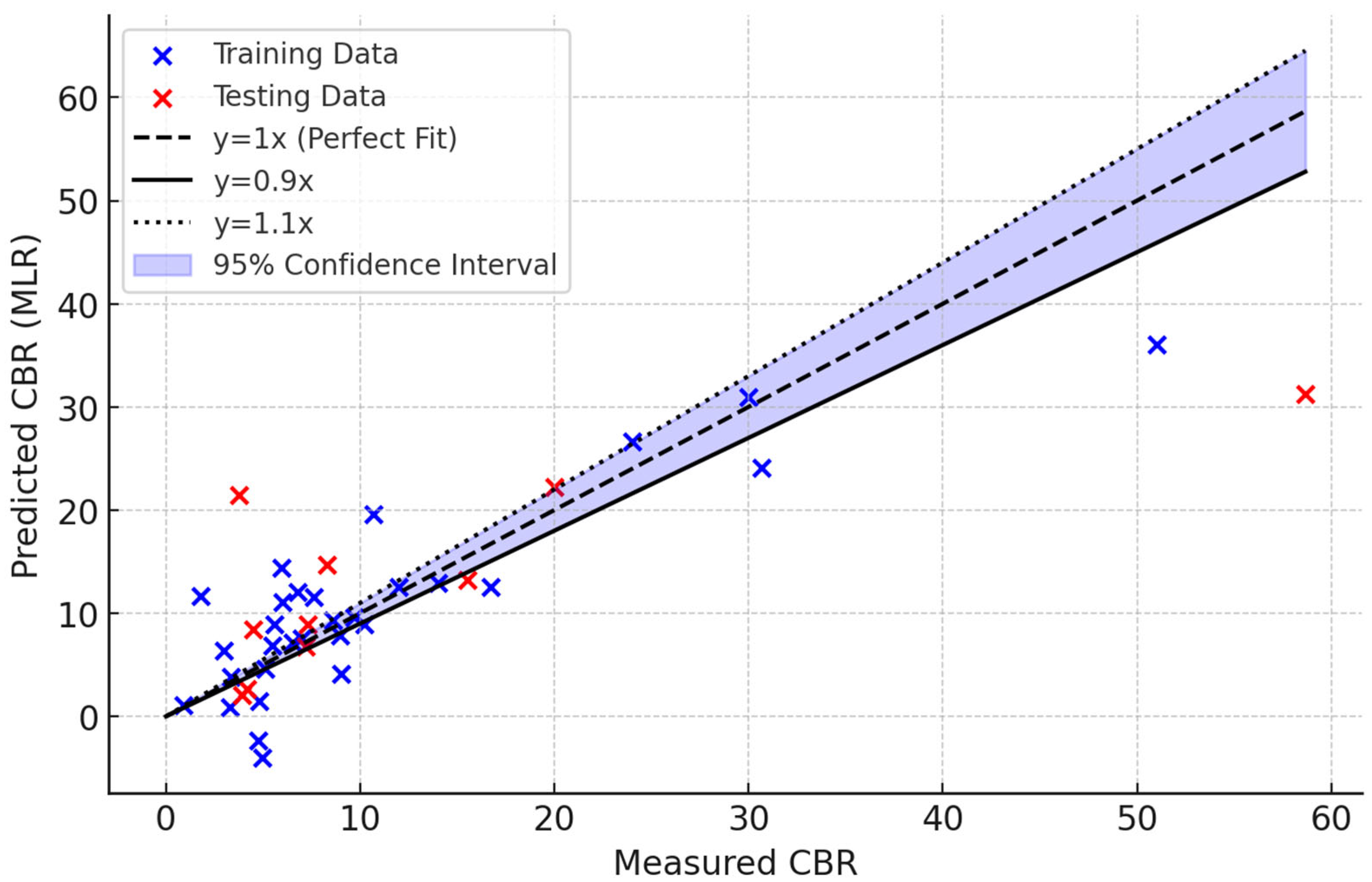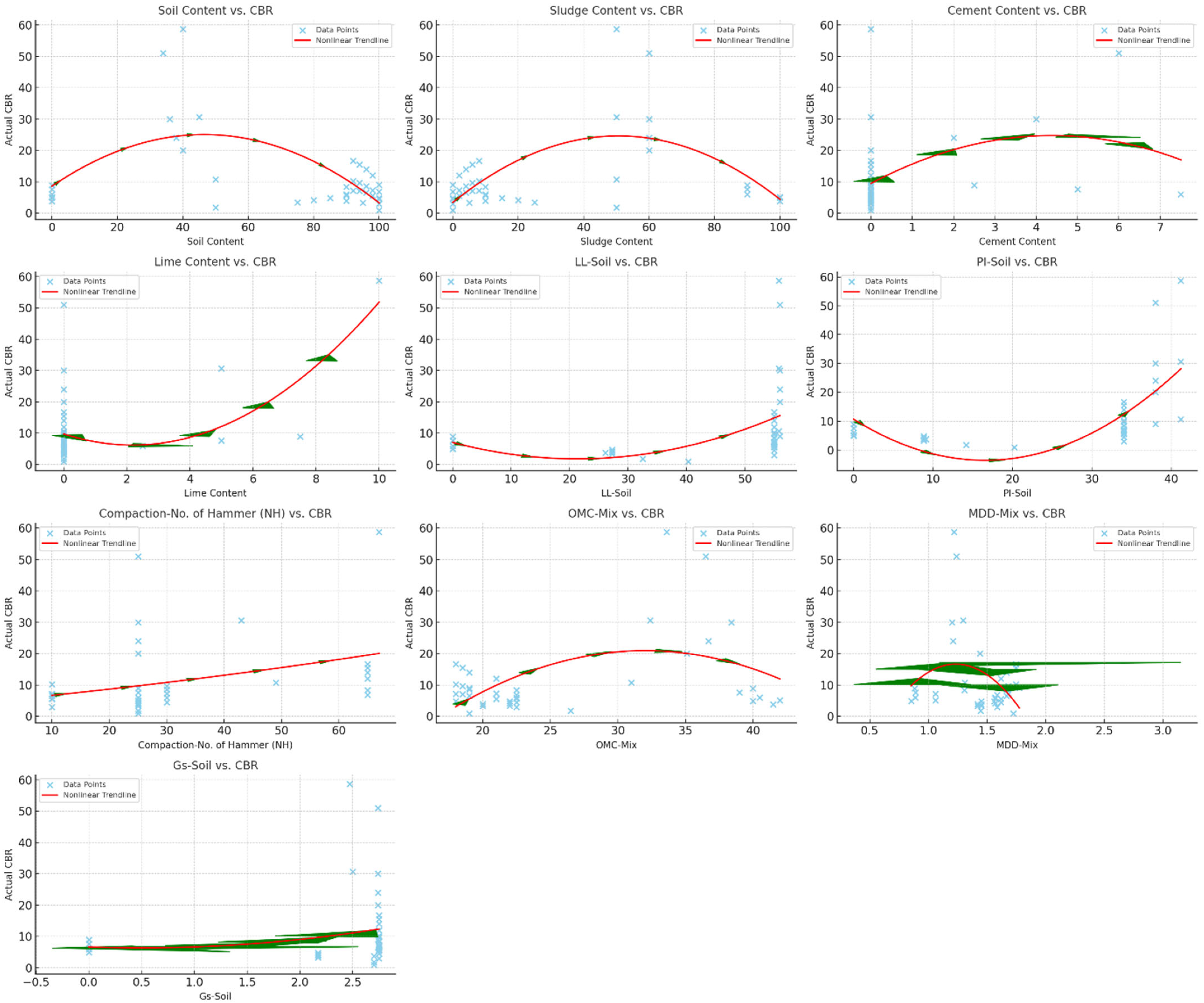 Since the linear correlation values between most parameters are below 0.8–0.9, the parameters do not exhibit a strong relationship and can be treated as independent variables in regression and machine learning models. Additionally, as the correlation between CBR and other parameters remains below this threshold, more advanced models, such as machine learning techniques, are required instead of simple linear regression to accurately predict CBR values.