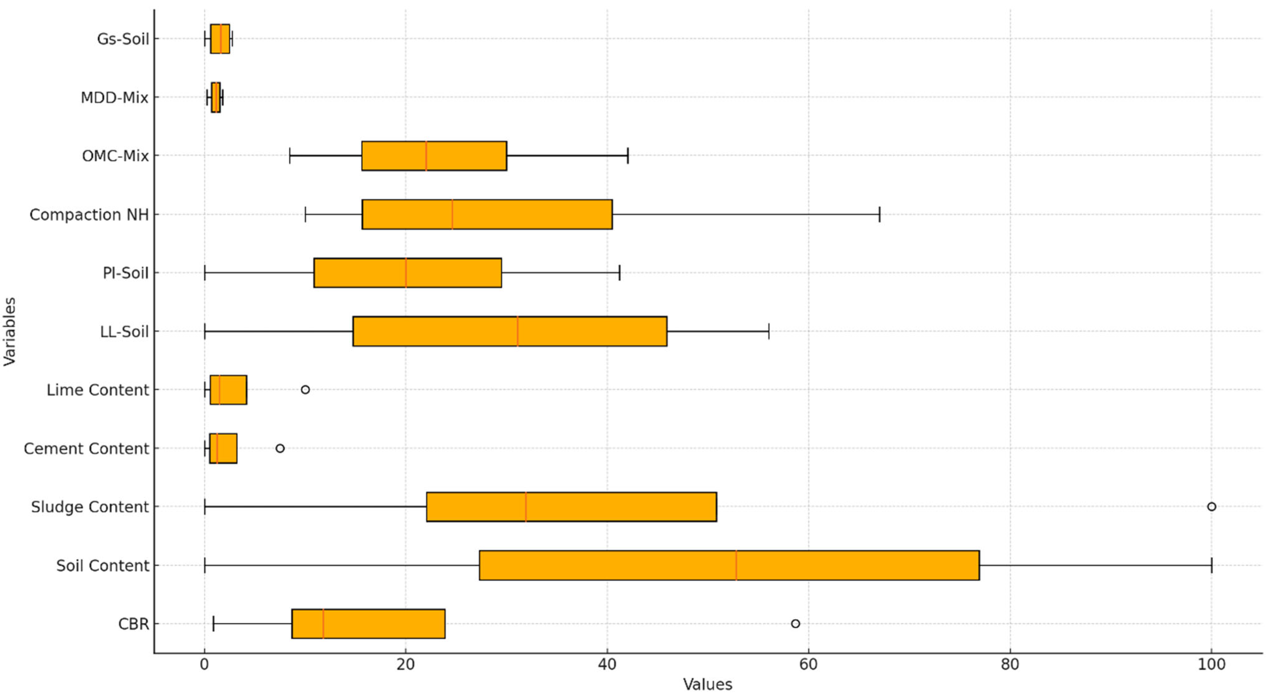 Figure 13 presents box plots illustrating the distribution of various geotechnical parameters, including soil content, sludge content, compaction characteristics, and CBR values. The spread and interquartile ranges highlight variability in these properties, with soil and sludge content exhibiting wider distributions, while parameters like specific gravity (G