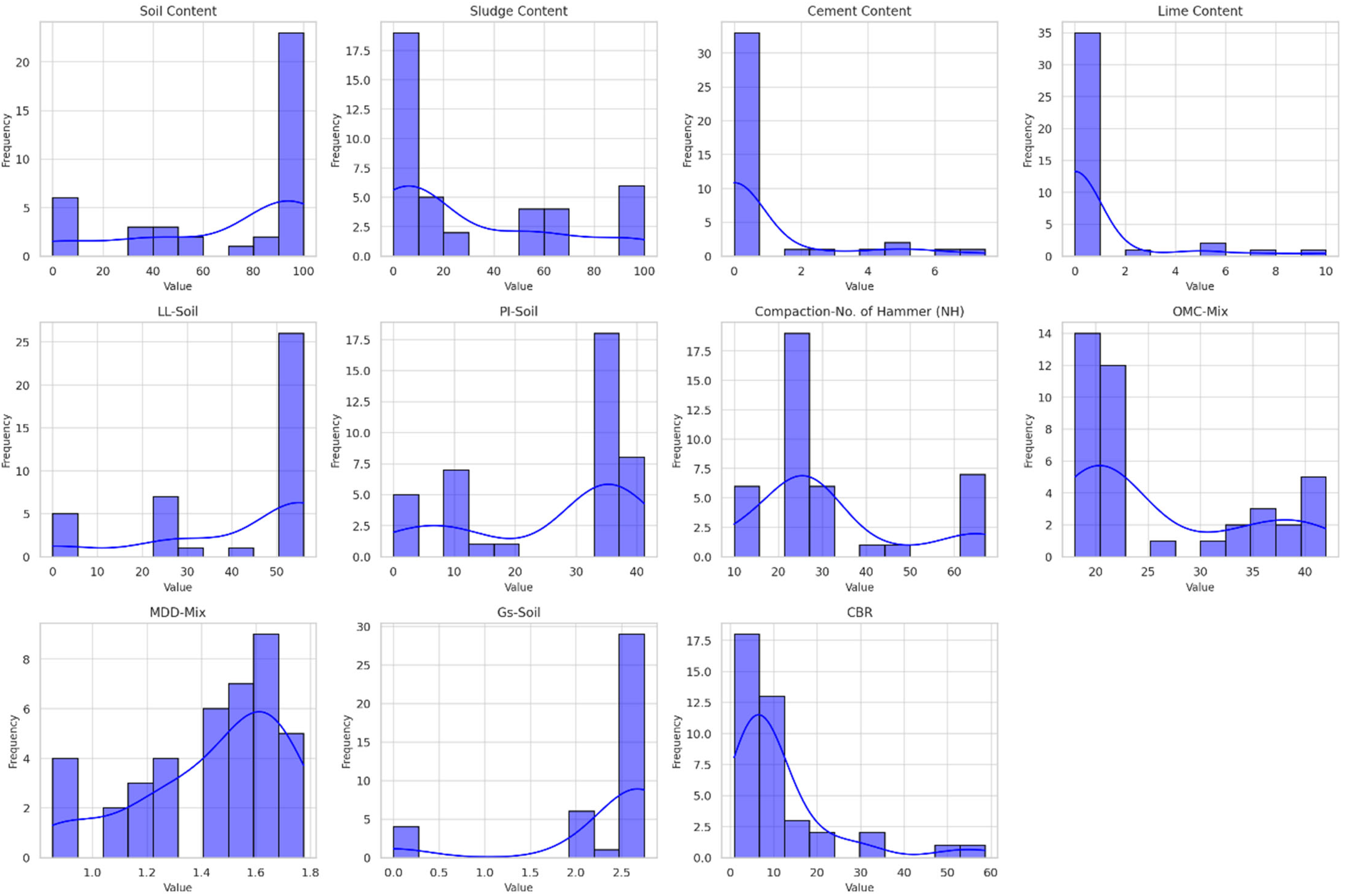 s-Soil), and California bearing ratio (CBR). The histograms represent the variability and central tendencies of each parameter, with notable trends such as the clustering of soil content and sludge content values around higher percentages, while cement and lime contents are predominantly low. Parameters like CBR and MDD-Mix show a broader range of values and indicate diverse material behaviours, which are critical for understanding the mixture’s suitability for construction applications.
