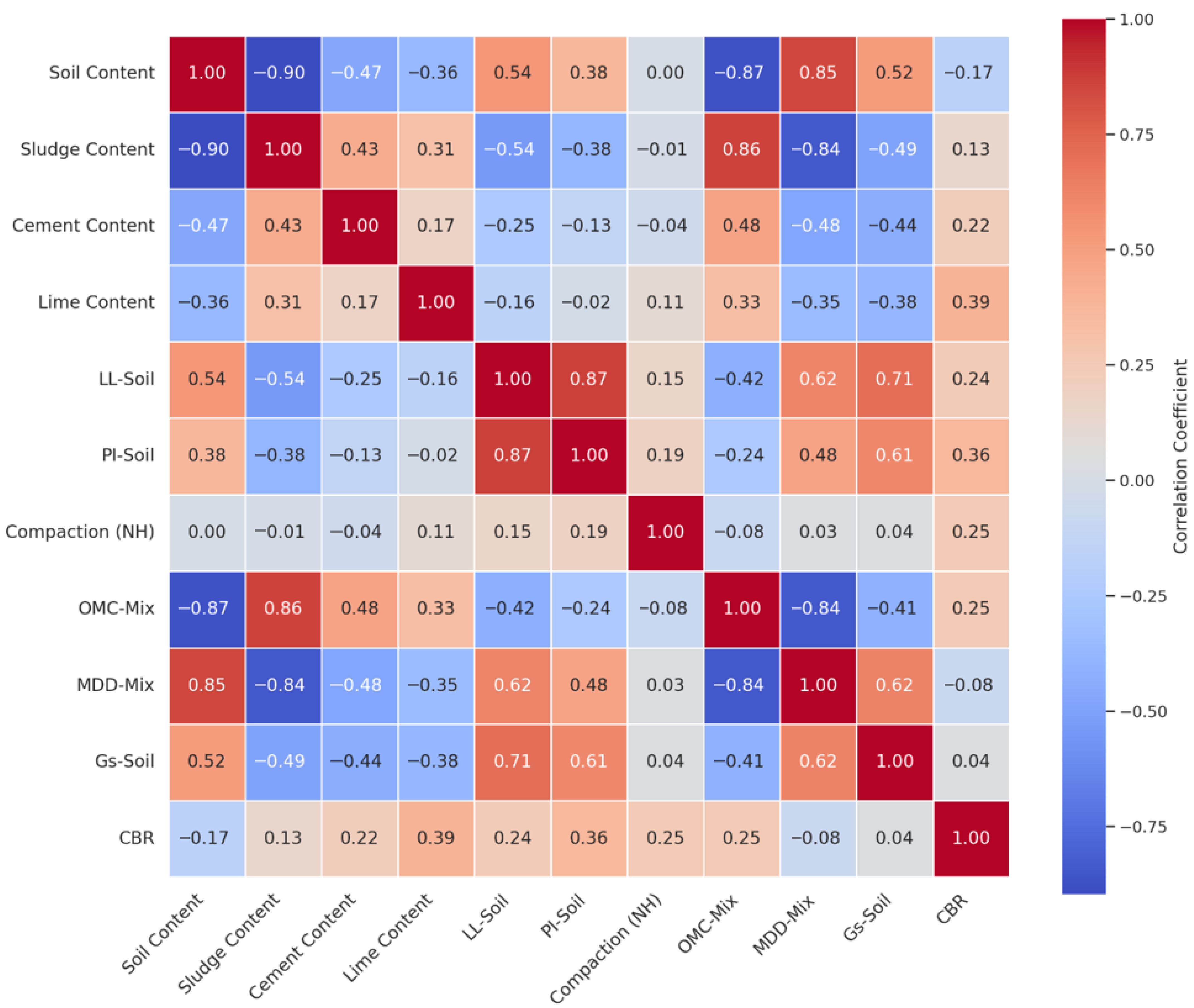 Figure 15 visually represents the relationships between key variables in the dataset. Correlation analysis plays a crucial role in understanding the interdependencies between various geotechnical parameters, influencing both the interpretation of results and the formulation of engineering recommendations. Strong positive correlations, such as between LL-Soil and PI-Soil (0.87), confirm expected relationships where higher liquid limit soils tend to have a higher plasticity index and affect soil workability and strength. Similarly, the strong correlation between MDD-Mix and Soil Content (0.85) reinforces the idea that higher soil content contributes to greater compaction efficiency, which is essential for foundation stability.