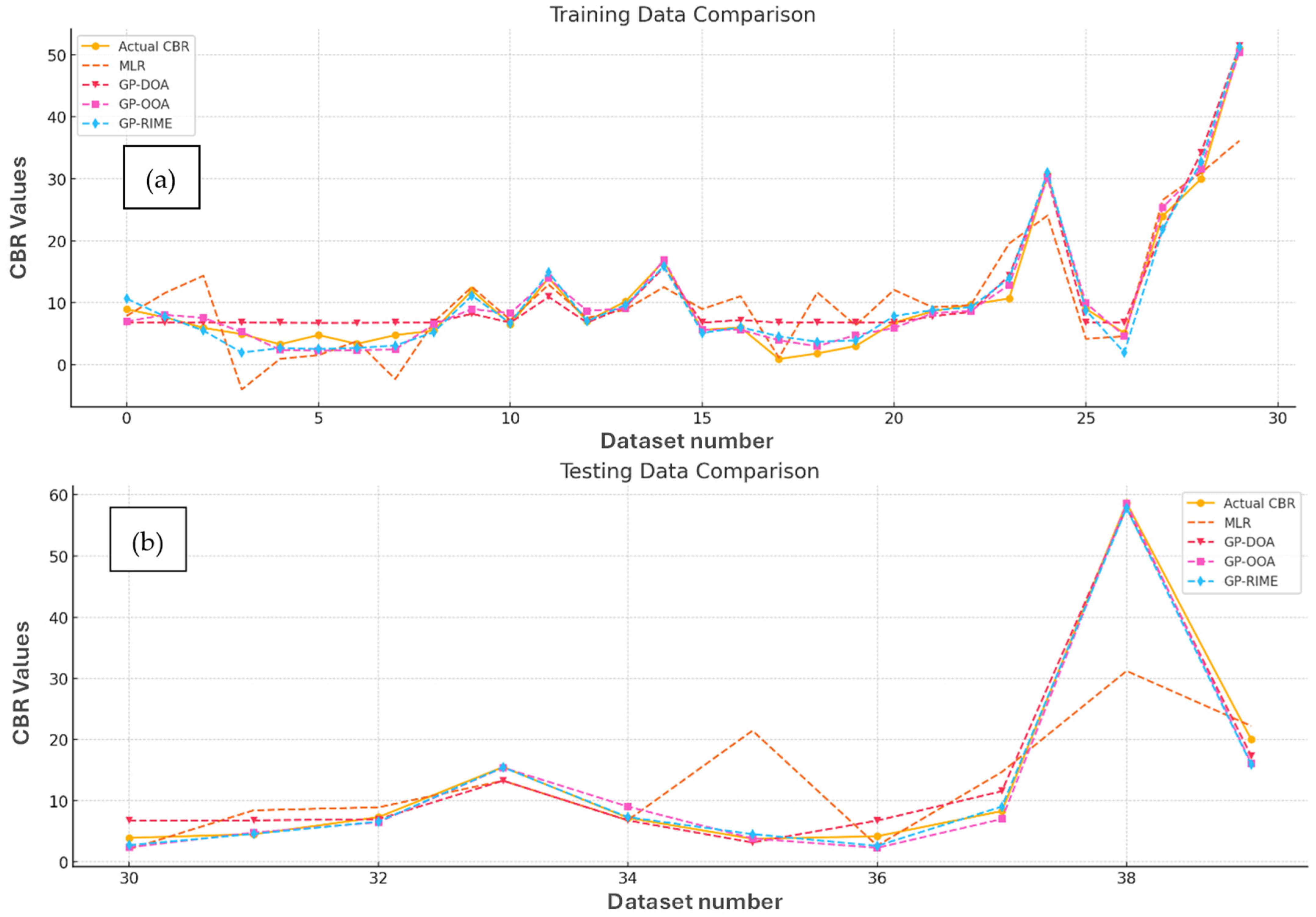 The testing data comparison further emphasises the differences between these models. The MLR model again struggles to generalise and show larger deviations from the actual CBR values, particularly at peak points. In contrast, the GP-DOA, GP-OOA, and GP-RIME models maintain a close match with the actual values, showcasing their robustness in handling unseen data. Among the advanced models, GP-RIME consistently exhibits the most accurate predictions and reinforces its superior generalisation ability.
