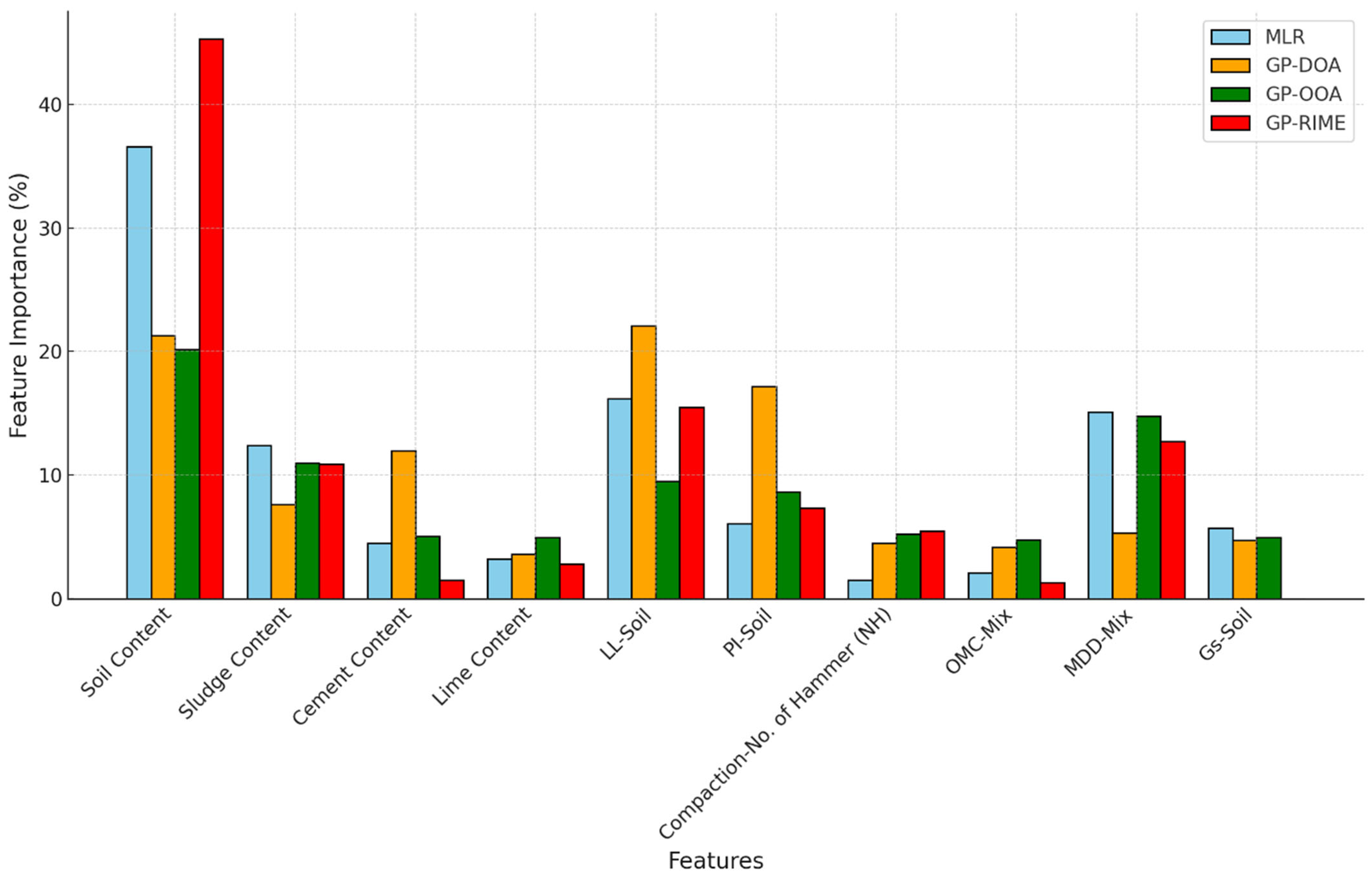 The feature importance for the different models (MLR, GP-DOA, GP-OOA, and GP-RIME) was calculated using distinct approaches based on the characteristics of each model. For MLR, the absolute values of the regression coefficients were normalised to determine their contribution to predicting CBR. For the GP-based models (DOA, OOA, and RIME), sensitivity analysis was performed by evaluating the contribution of each input variable to the predicted CBR values. The MAE approach was applied to estimate the relative influence of each feature by assessing the changes in model outputs when specific input variables were varied. These normalised contributions were used to compute the percentage importance of each parameter and ensured consistent comparisons across models.