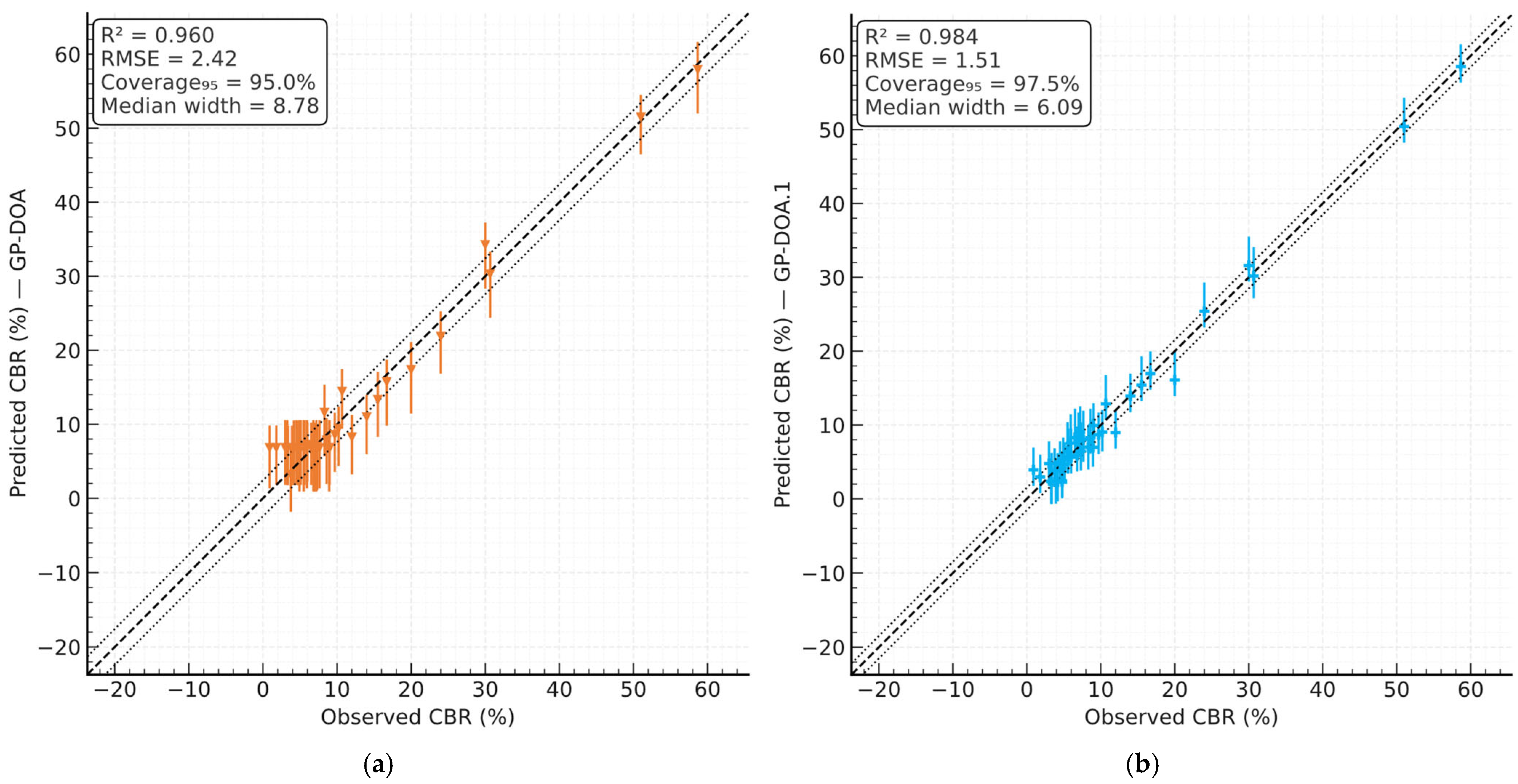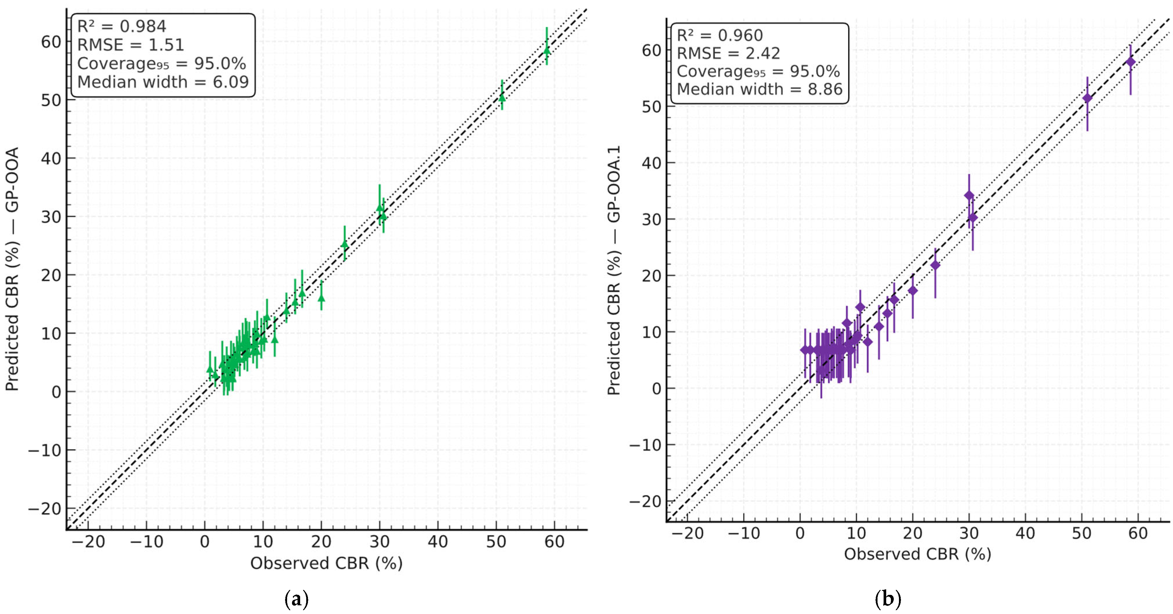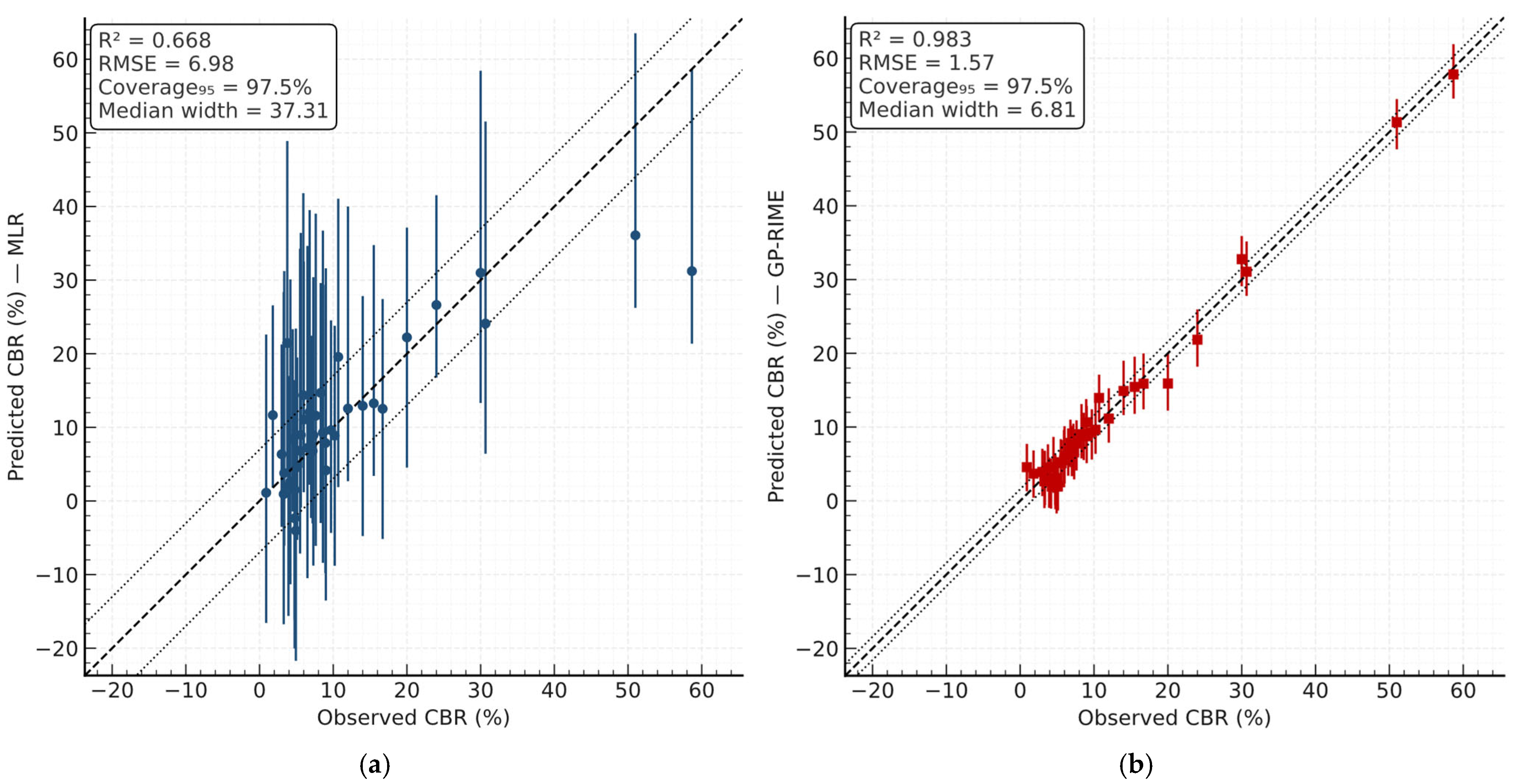 Across the updated dataset, coverage values are close to the nominal 95% for all models, while interval widths vary by model family: GP variants concentrate uncertainty more tightly (median 6–9 CBR %), in contrast to MLR (≈33 CBR %), consistent with the higher flexibility of symbolic GP expressions under similar residual variability. This behaviour is also visible in the width–prediction profiles, where GP intervals remain comparatively stable across the prediction range.