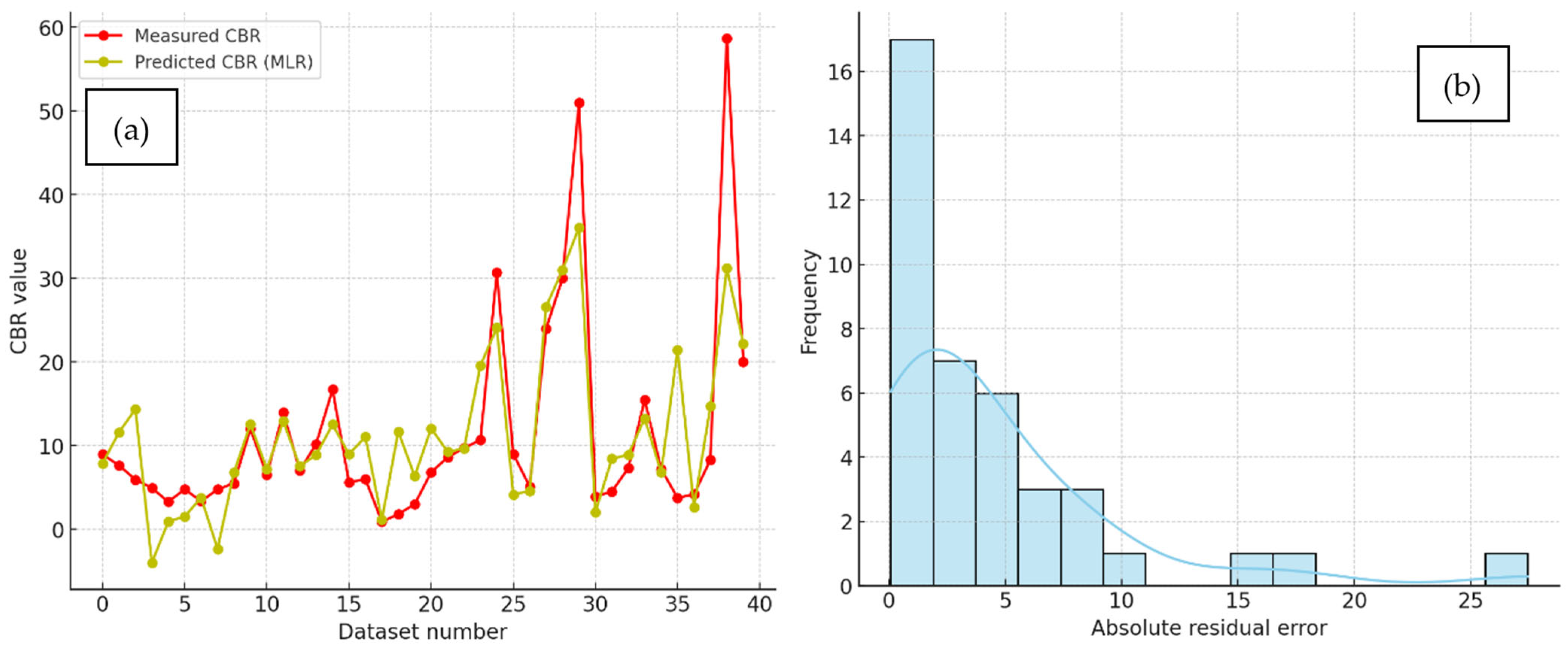 Given the small-n regime, two caveats apply. First, reported dispersion (±SD over five outer folds) reflects sampling variability; future expansions of the dataset would further stabilise estimates and tighten uncertainty. Second, the study currently targets the unsoaked CBR response; extension to soaked CBR is recommended to align with conservative pavement design scenarios. Despite these constraints, the combined nested-CV + permutation framework provides a defensible, small-sample validation that directly addresses overfitting concerns.