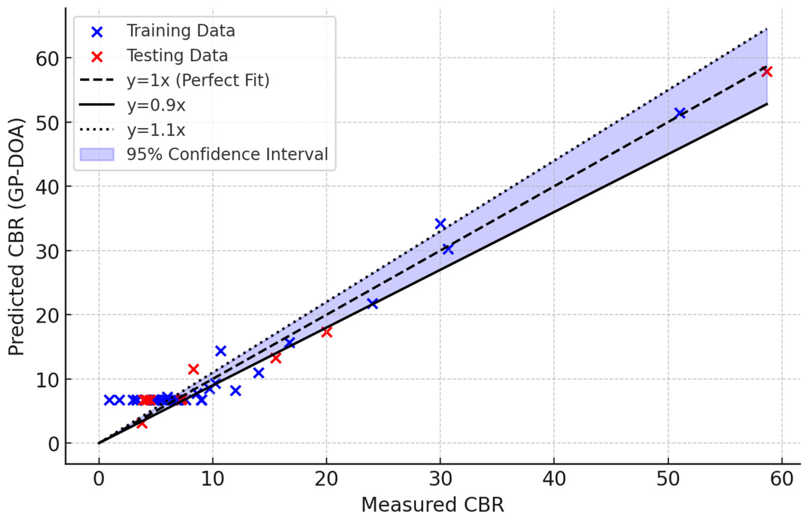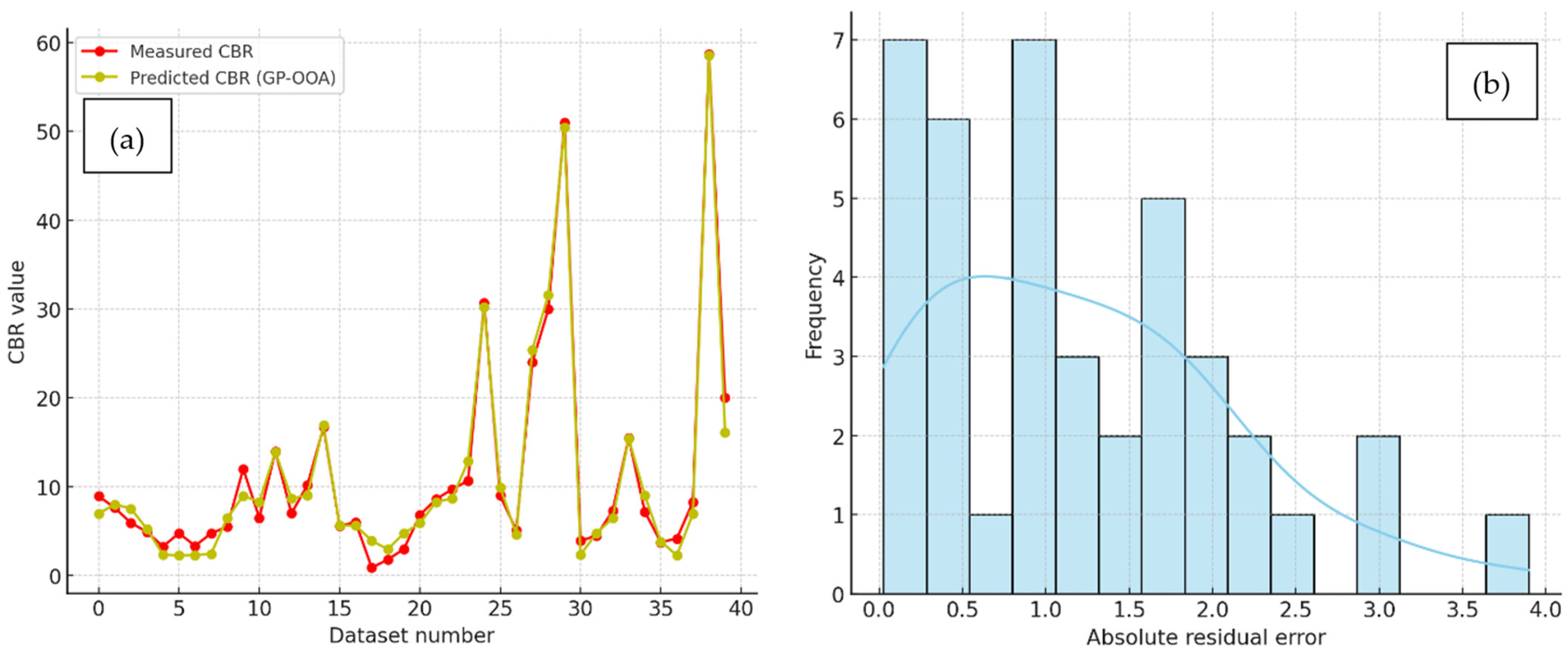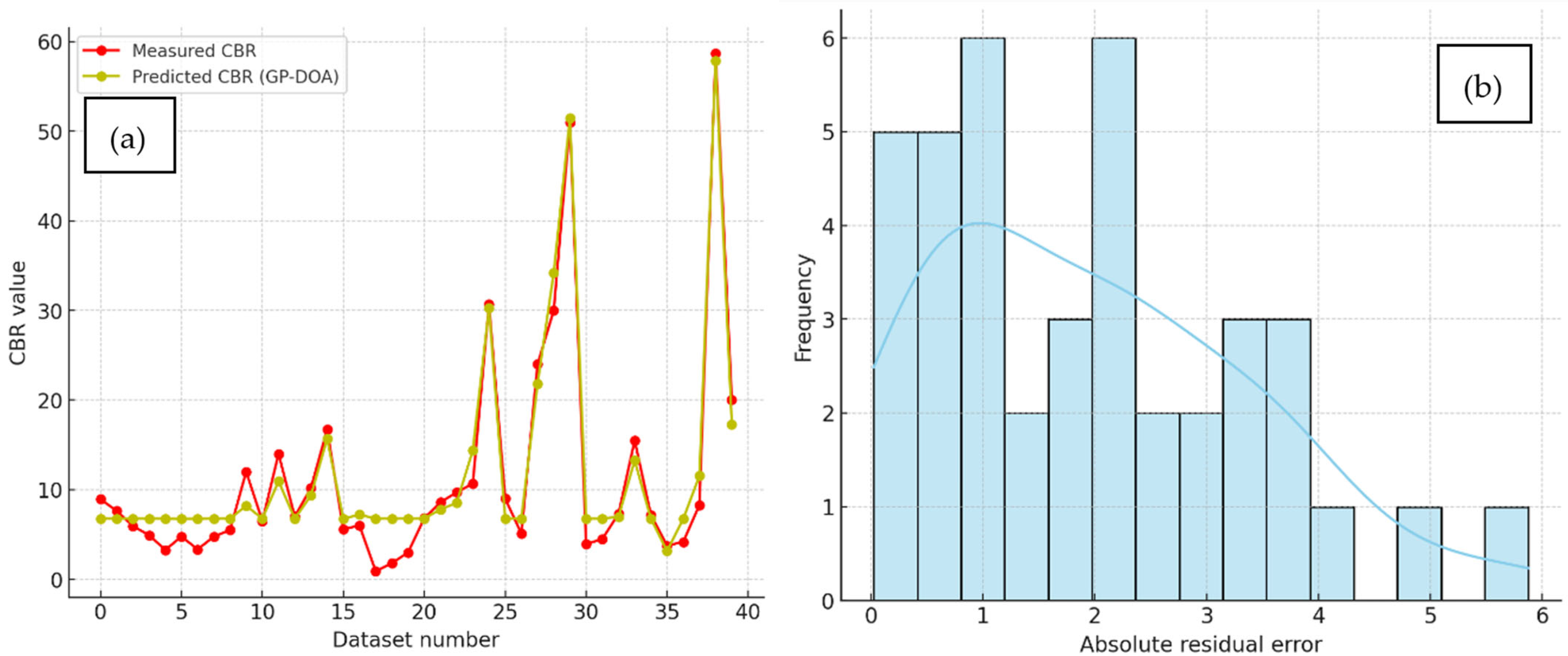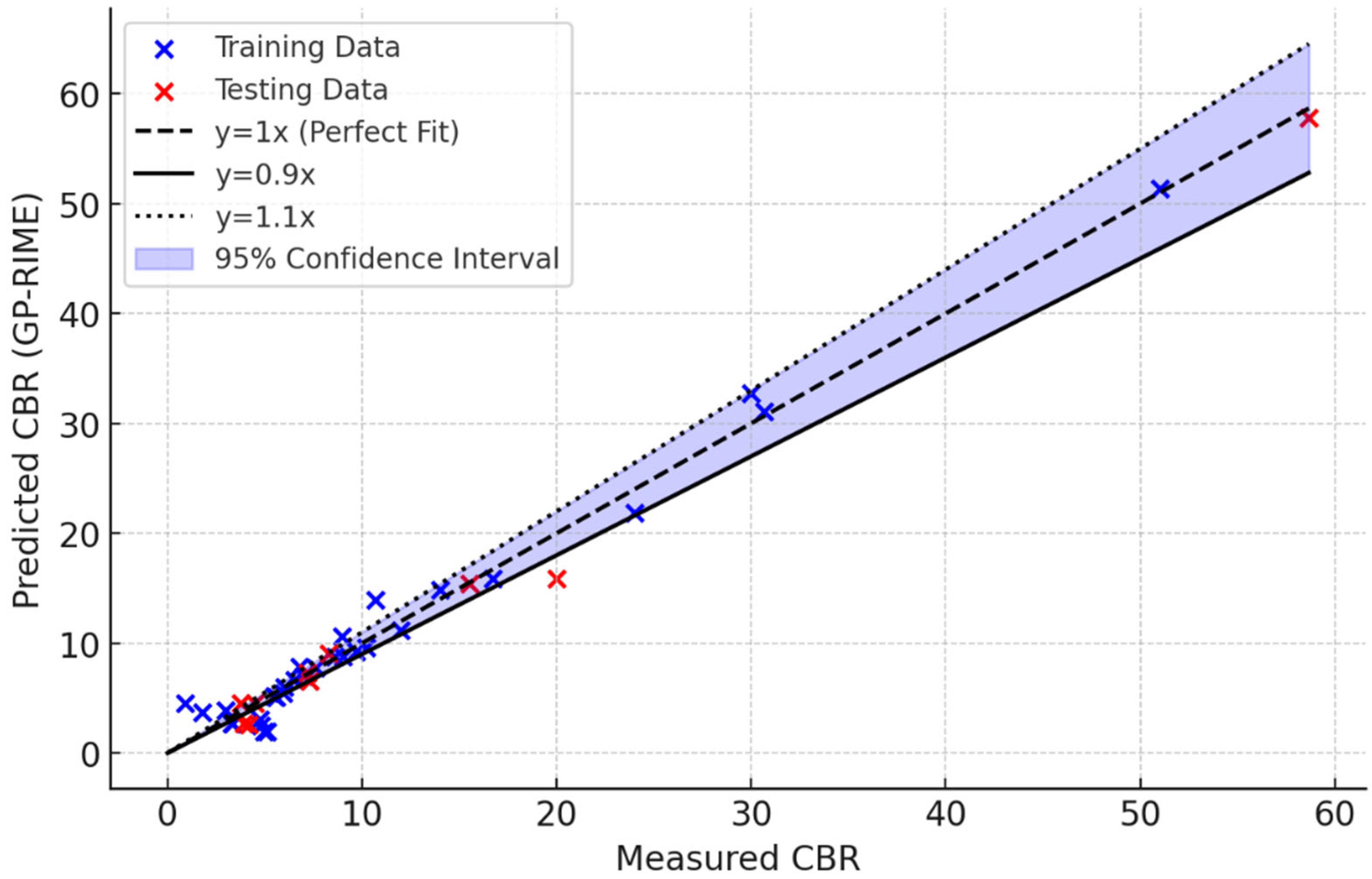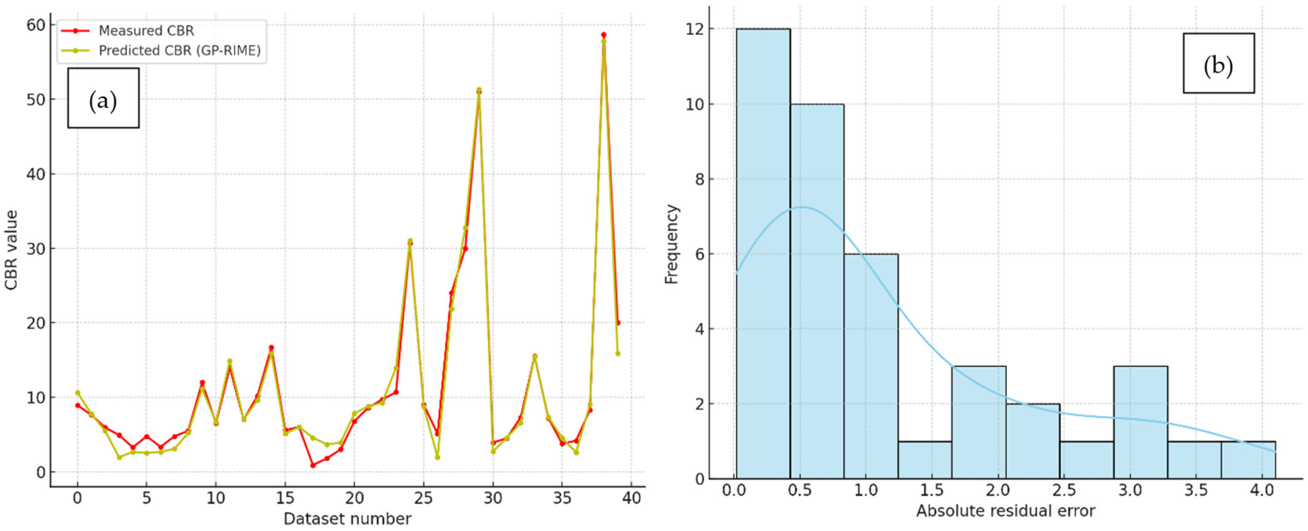 The results show that the a20 index improves significantly across the models, with the traditional Multiple Linear Regression (MLR) model achieving the lowest value (37.5%). In contrast, the GP-RIME model achieved the highest accuracy, with 70.0% of its predictions falling within a ±20% deviation from the actual CBR values. The progressive improvement across GP-DOA (47.5%), GP-OOA (60.0%), and GP-RIME (70.0%) highlights the strength of integrating genetic programming with metaheuristic algorithms in capturing complex, nonlinear soil behaviour. These findings support the suitability of the GP-RIME model for reliable and interpretable geotechnical predictions.