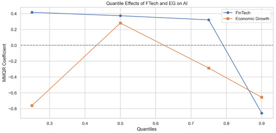 This figure plots the estimated MMQR coefficients of FinTech and Economic Growth on AI across different quantiles (25th, 50th, 75th, 90th). FinTech’s influence is strongest and positive at lower quantiles, but declines and even turns negative at the upper quantile, suggesting diminishing returns or over-saturation in high-digital environments. Economic Growth shows inconsistent effects, remaining largely negative across quantiles, which implies that growth alone does not drive AI development without complementary innovation policy.