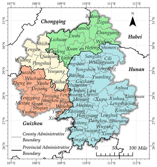 A total of 71 county units (administrative unit second only to prefecture-level cities) are selected in Wuling Mountain area (including counties, municipal districts, county-level cities, and autonomous counties) as the research objects. Wuling Mountain area covers an area of about 110,000 square kilometers and has a population of about 23 million, of which ethnic minorities account for about 48.9%. It is the largest and most populous ethnic minority settlement in China’s inland cross-provincial border area. It is also one of the national key ecological functional areas. Our study comprises 71 county-level administrative units. These are identified through the officially defined geographic coverage in China’s State Council-approved Wuling Mountain Area Regional Development and Poverty Alleviation Plan (2011–2020). This selection framework systematically includes every county-level division within the targeted region. It spans the border areas of Hunan, Guizhou, Hubei, and Chongqing, and covers 71 counties (cities and districts), including 37 in Hunan, 16 in Guizhou, 11 in Hubei, and 7 in Chongqing (Figure 1). Due to the impact of complex terrain and lagging social and economic development, the urbanization rate in the district is lower than the national average by 65.22% []. Since 2011, Wuling Mountain area has been included in the national overall development strategy, and the Wuling Mountain Economic Cooperation Zone has also become one of the key areas for the new round of western development. As of 2021, the urban population of counties and county-level cities accounted for about 30% of the national urban population, and their number accounted for about 65% of the county-level administrative divisions []. According to the existing forecast [], the average population of counties will increase to about 110,000 by 2025, and the proportion of the urban population will remain at about 18%. The six central cities in the district, such as Zhangjiajie, Jishou, Huaihua, Tongren, Enshi, and Qianjiang, play a core leading role in promoting the integrated urban–rural development.